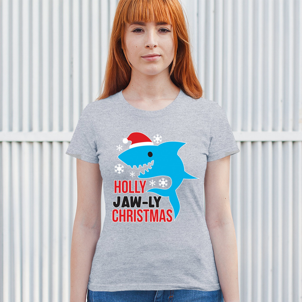 Funny Holly Jaw-ly Christmas shark pun design with Santa hat and snowflakes. Perfect for ocean lovers, festive parties, and cheerful holiday fun.
