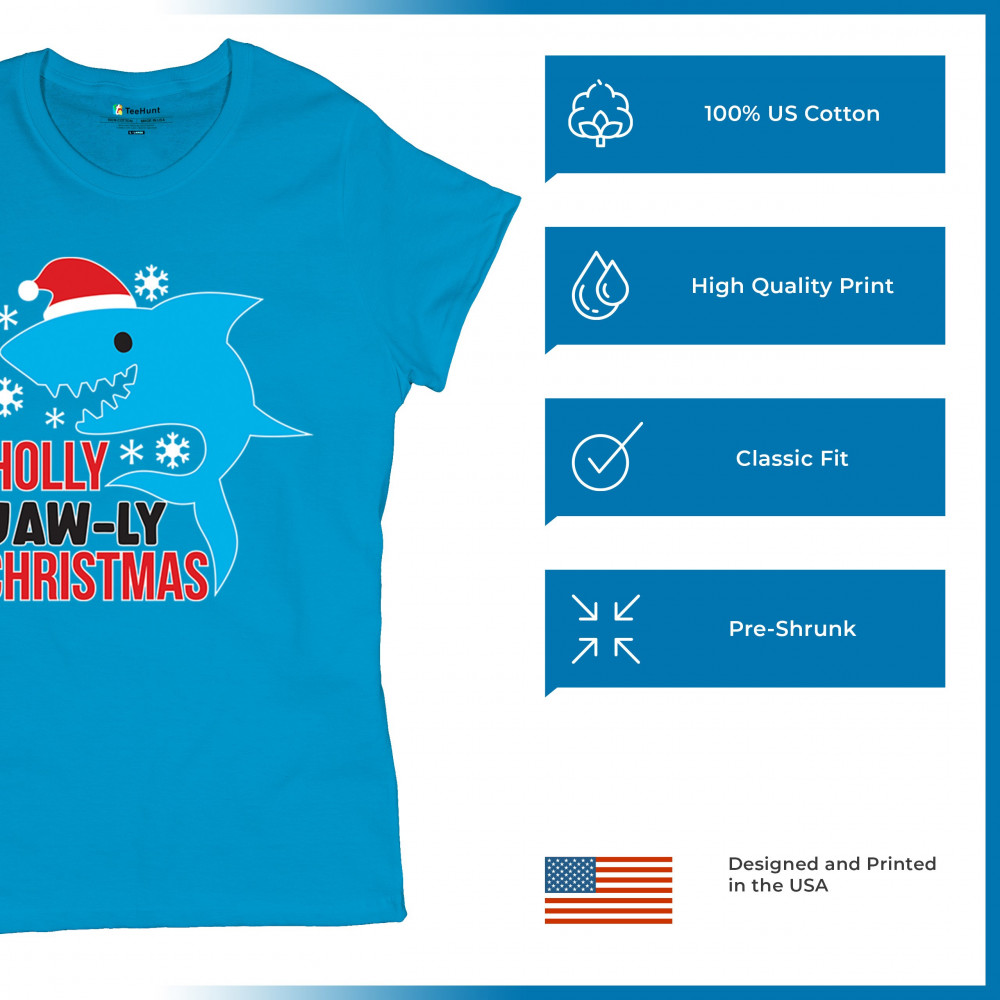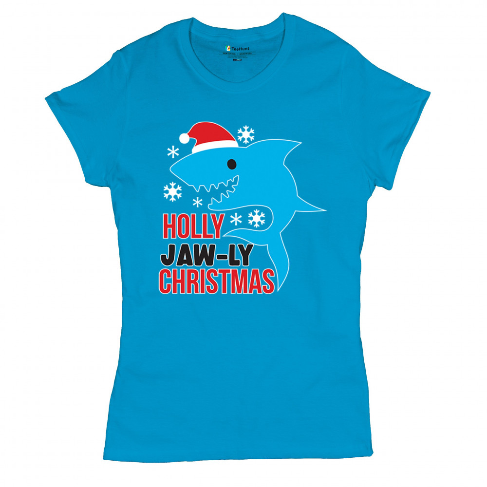A fun Holly Jaw-ly Christmas design featuring a cheerful shark in a Santa hat with bright snowflake accents. Ideal for beach lovers, ocean fans, pun humor enthusiasts, Christmas parties, festive gatherings, white elephant events, and lighthearted winter celebrations. Brings a playful coastal vibe to holiday season outfits and gifts.
