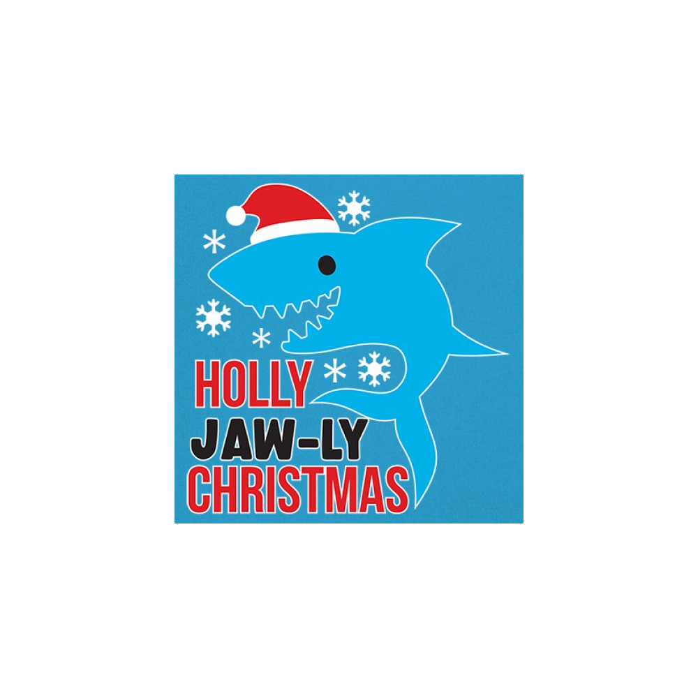 Funny Holly Jaw-ly Christmas shark pun design with Santa hat and snowflakes. Perfect for ocean lovers, festive parties, and cheerful holiday fun.
