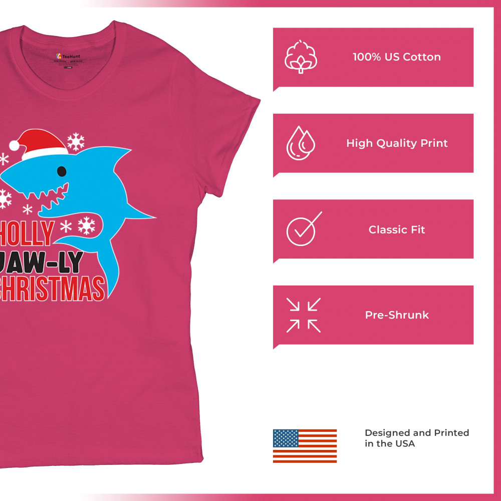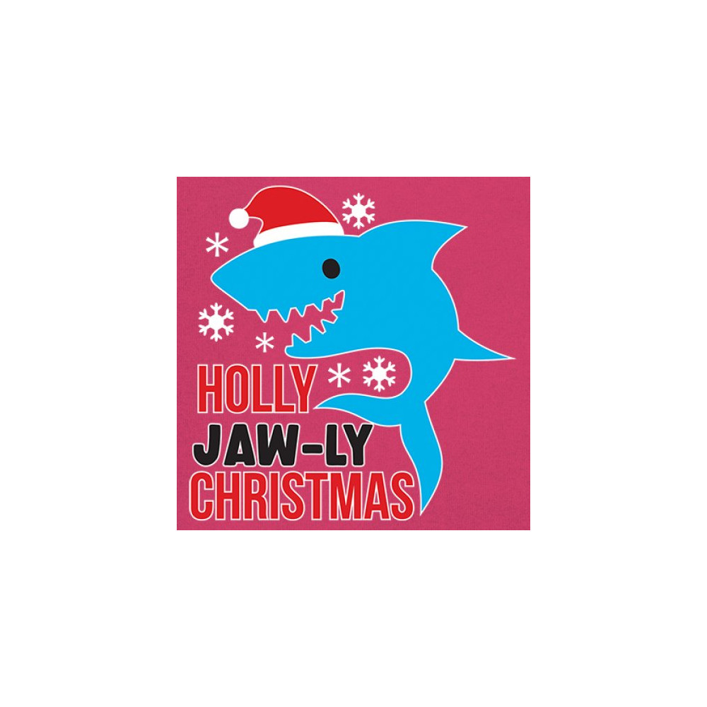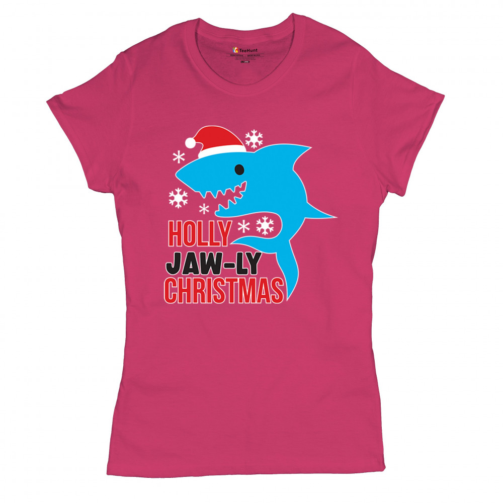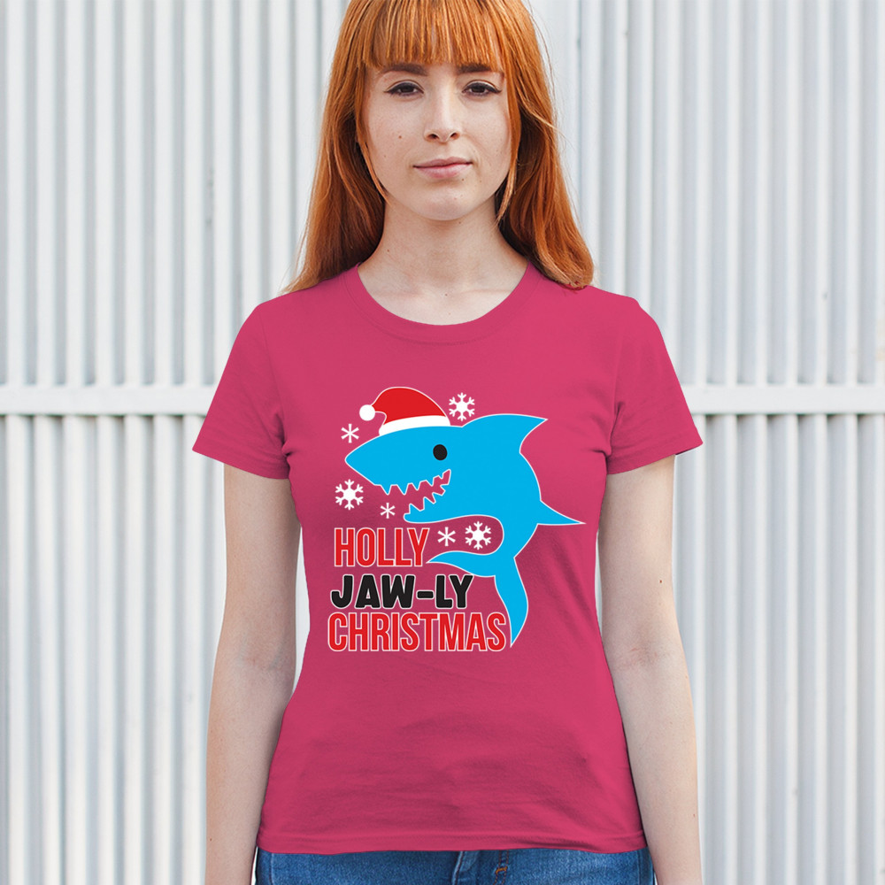 Funny Holly Jaw-ly Christmas shark pun design with Santa hat and snowflakes. Perfect for ocean lovers, festive parties, and cheerful holiday fun.