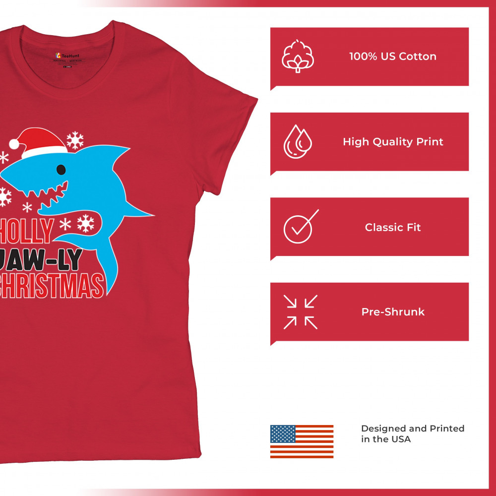 A fun Holly Jaw-ly Christmas design featuring a cheerful shark in a Santa hat with bright snowflake accents. Ideal for beach lovers, ocean fans, pun humor enthusiasts, Christmas parties, festive gatherings, white elephant events, and lighthearted winter celebrations. Brings a playful coastal vibe to holiday season outfits and gifts.