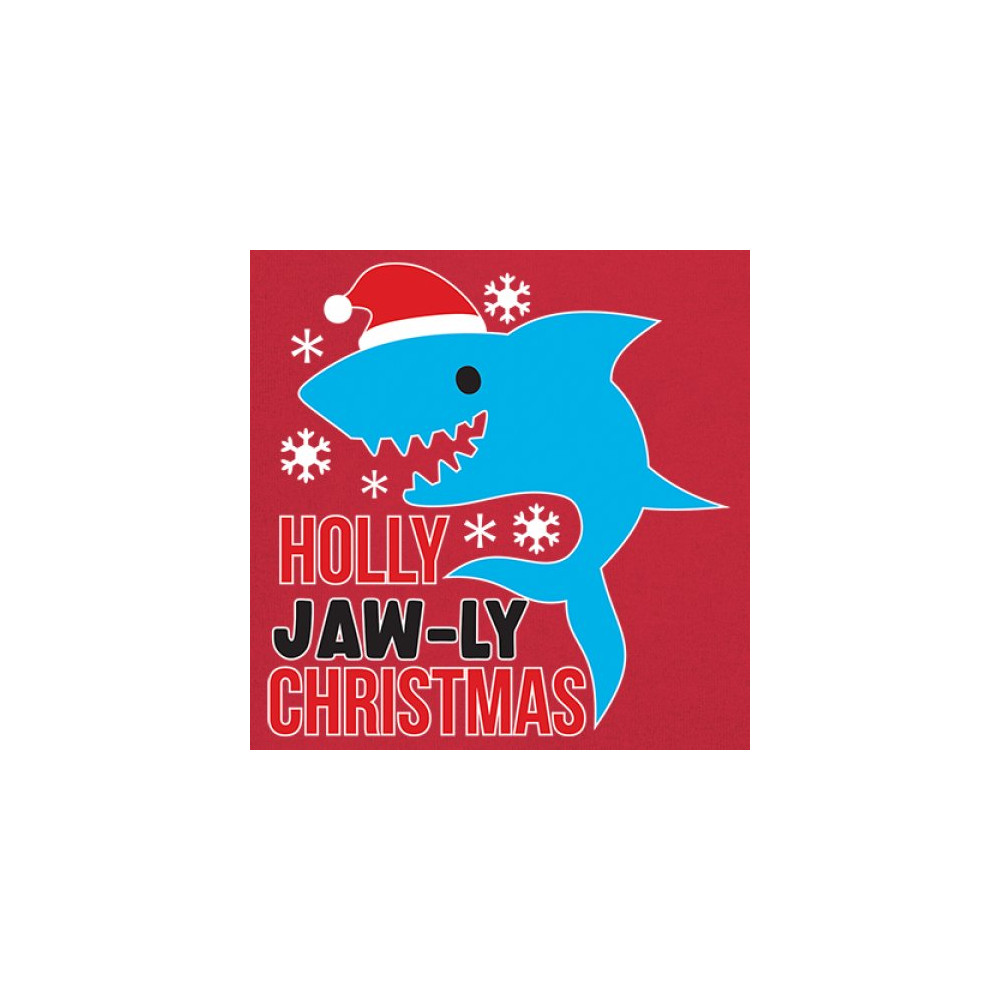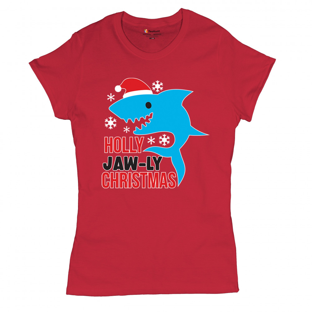 Funny Holly Jaw-ly Christmas shark pun design with Santa hat and snowflakes. Perfect for ocean lovers, festive parties, and cheerful holiday fun.