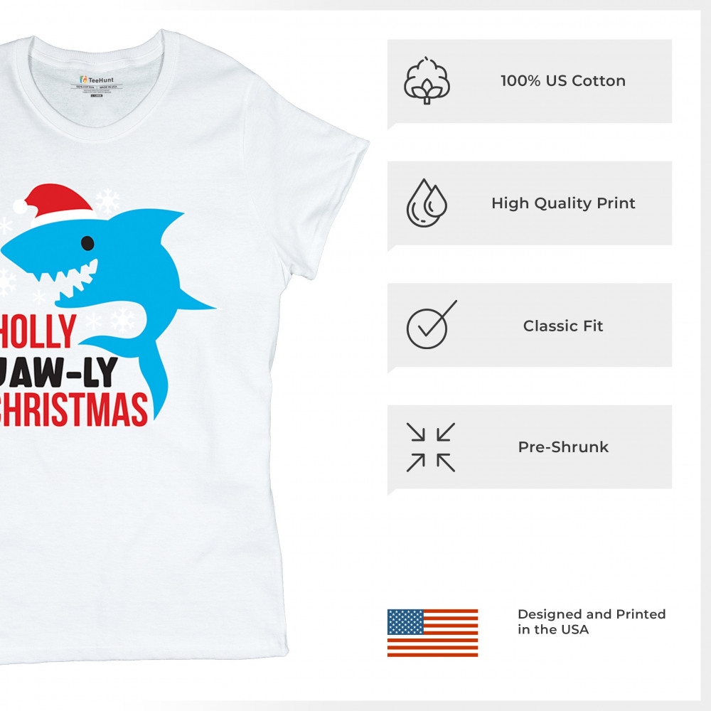 Funny Holly Jaw-ly Christmas shark pun design with Santa hat and snowflakes. Perfect for ocean lovers, festive parties, and cheerful holiday fun.