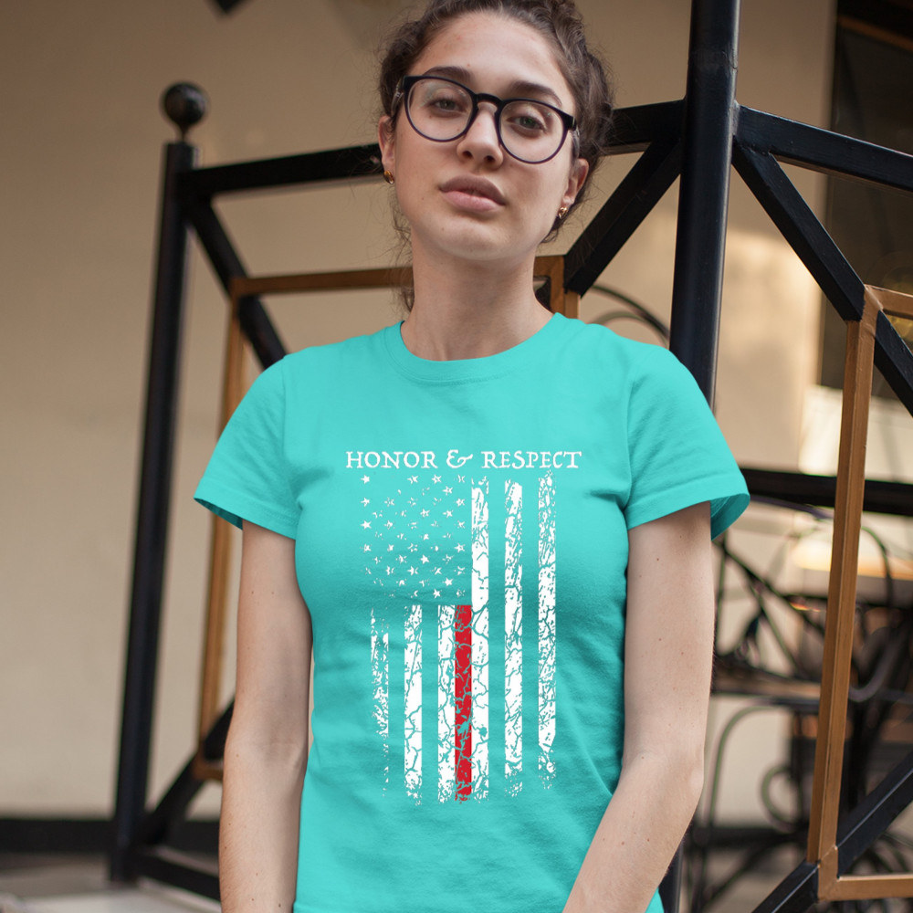 HONOR & RESPECT THIN RED LINE t-shirt firefighter american flag women's tee light blue