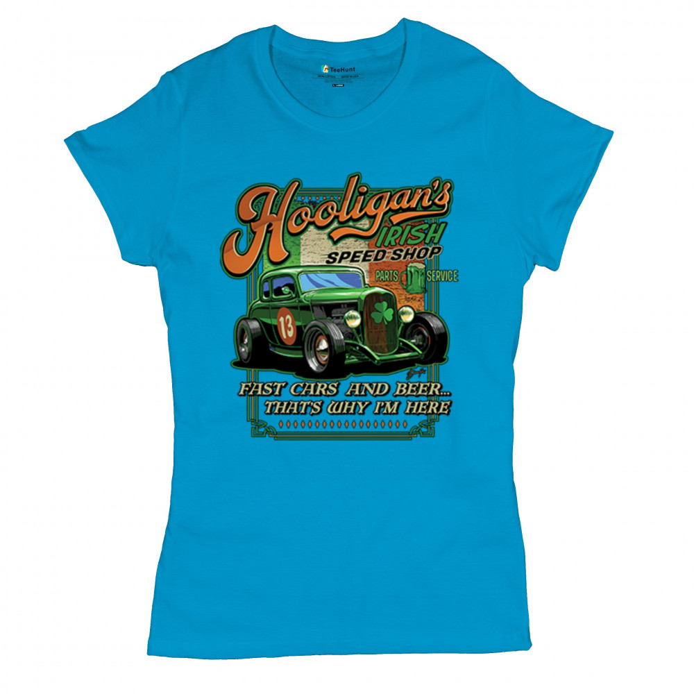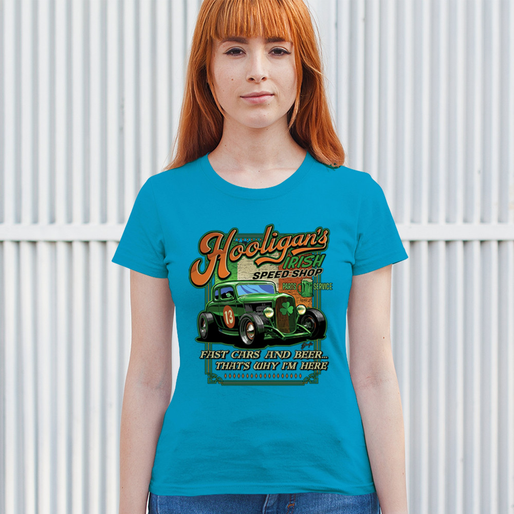 HOOLIGAN'S IRISH SPEED SHOP hooligans irish speed shop st patricks day t-shirt hot rod shamrock women's tee light blue