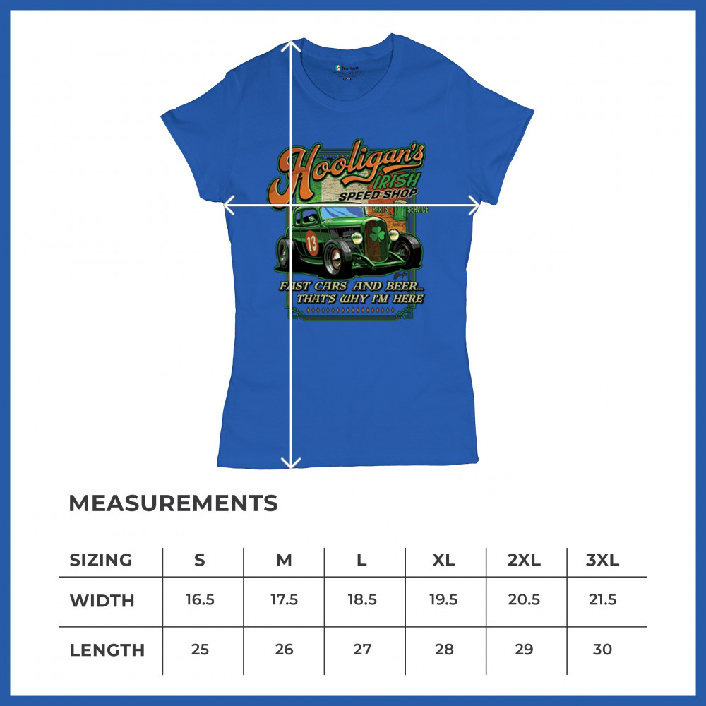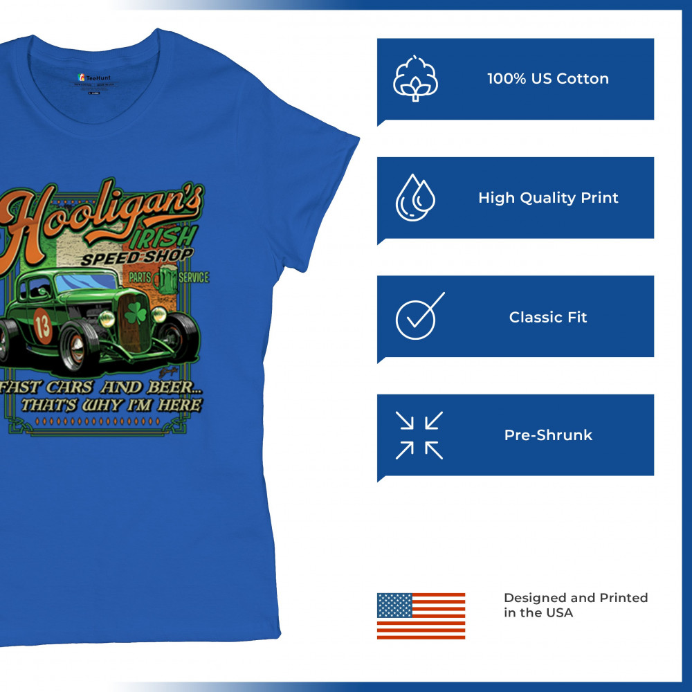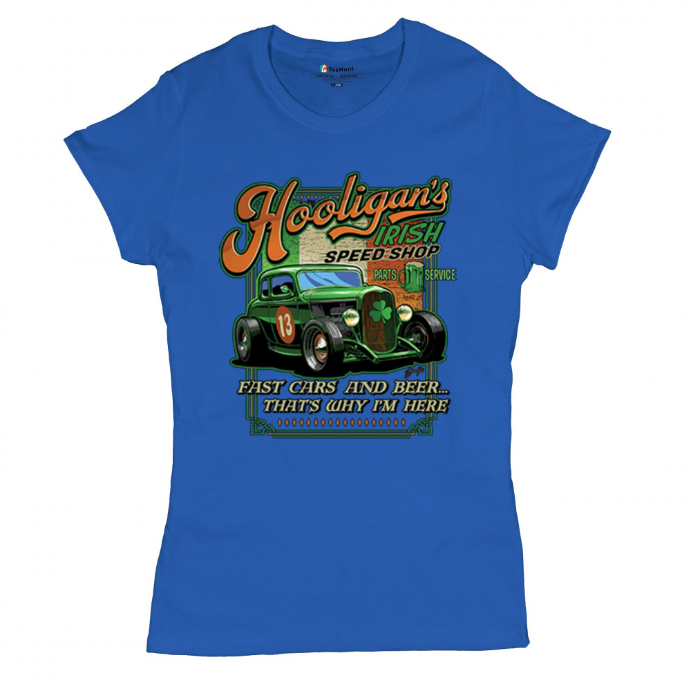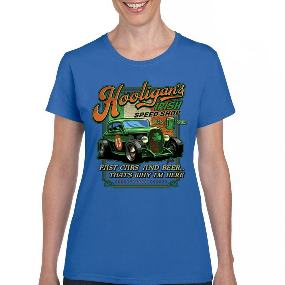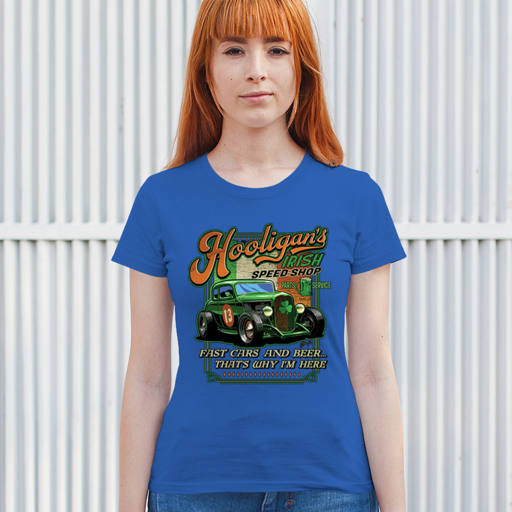HOOLIGAN'S IRISH SPEED SHOP hooligans irish speed shop st patricks day t-shirt hot rod shamrock women's tee royal blue