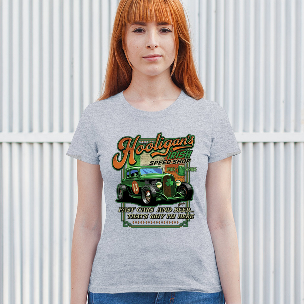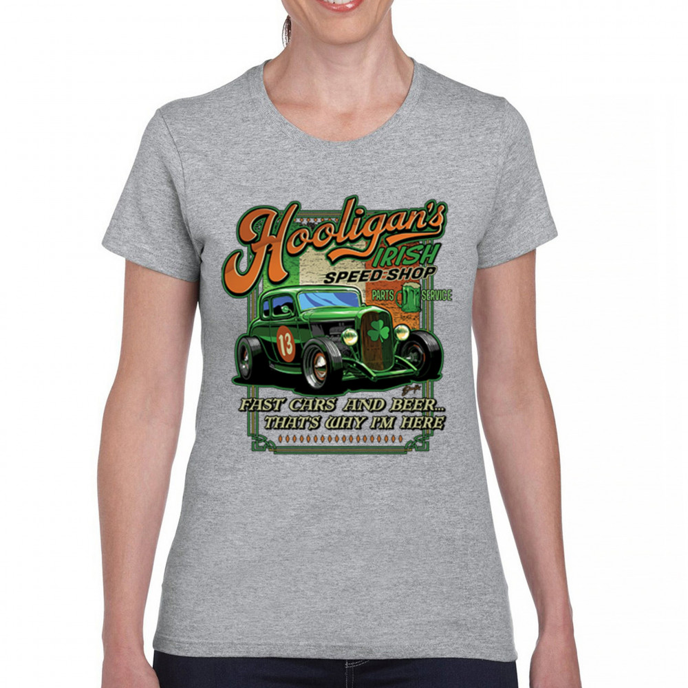 HOOLIGAN'S IRISH SPEED SHOP hooligans irish speed shop st patricks day t-shirt hot rod shamrock women's tee gray