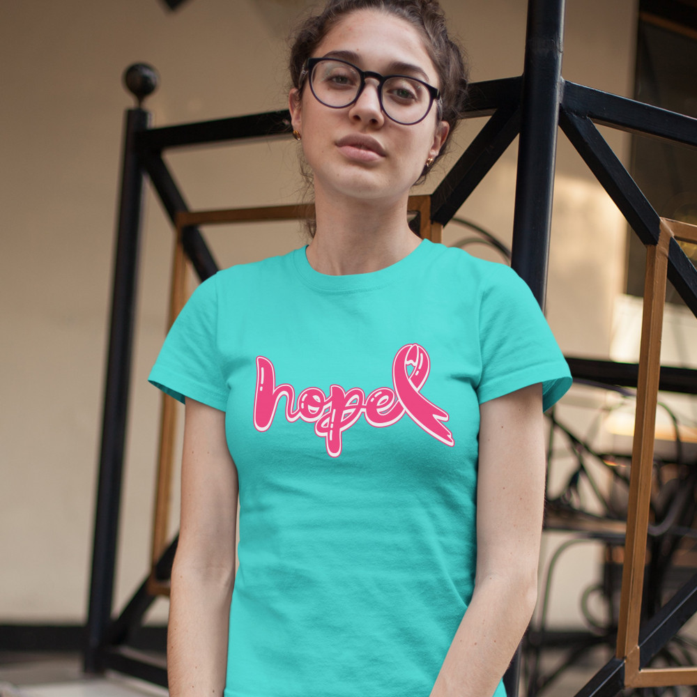 A print saying "Hope". The letter "e" is a part of a pink ribbon. Wear it to spread awareness abouth the disease and support a person you know who is battling it at the moment.