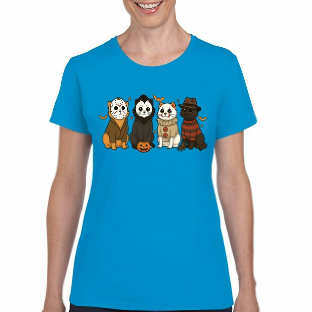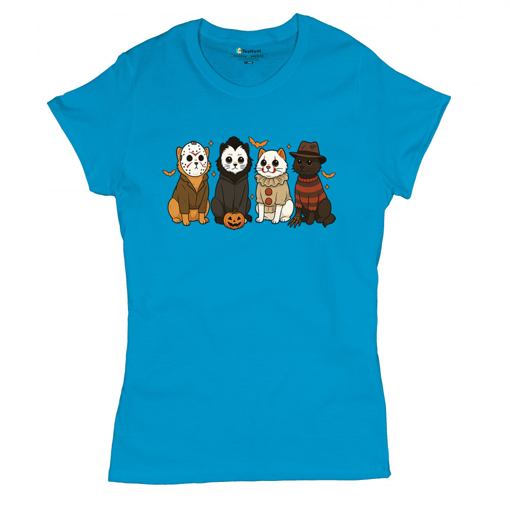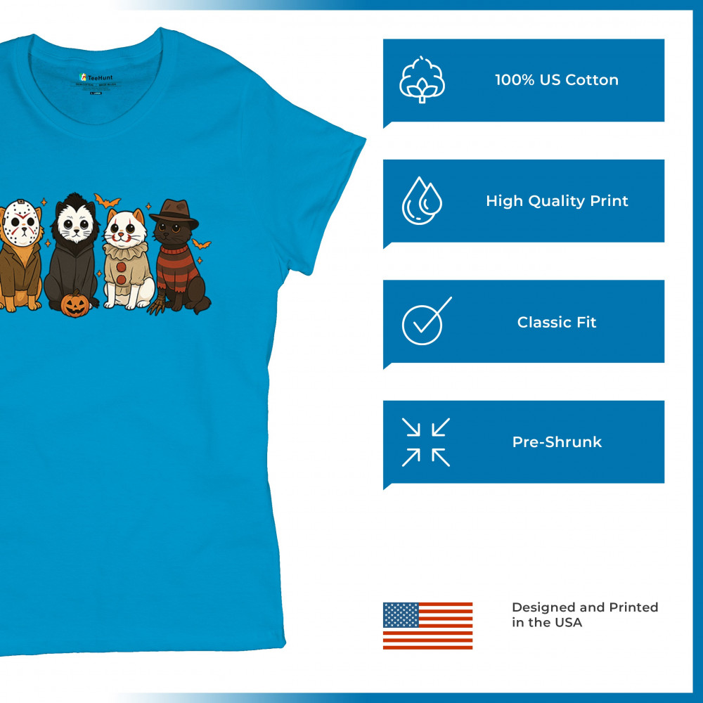 Horror Cats Halloween design with spooky costumes, Jack o Lantern details, and Haunted House vibes. Perfect October 31 outfit for cat lovers.