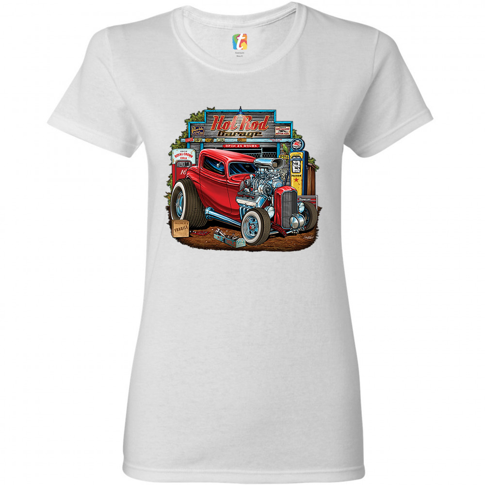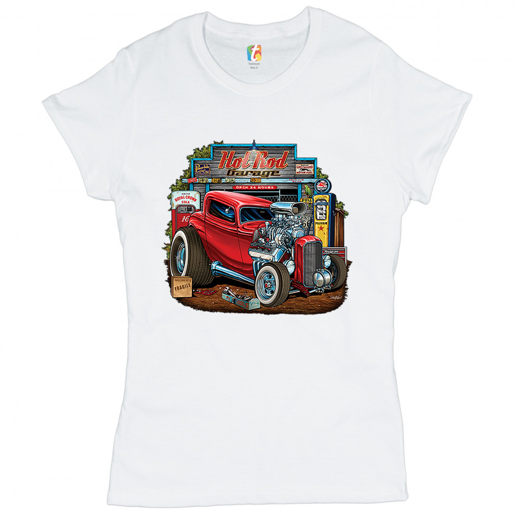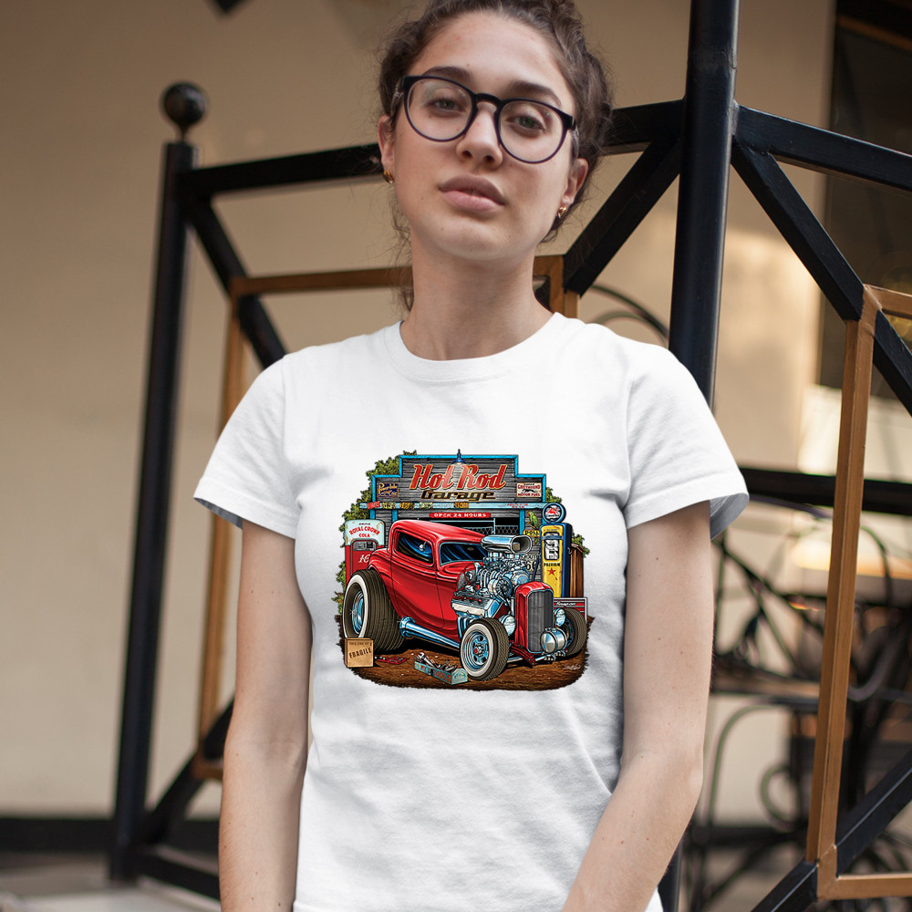 A print featuring a vintage hot rod with an exposed engine and plus-sized rear wheels. In the background there is a garage with a gas station and a sign that says: "Hot Rod Garage". A great choice for a fan of customized American classic cars and hot rods