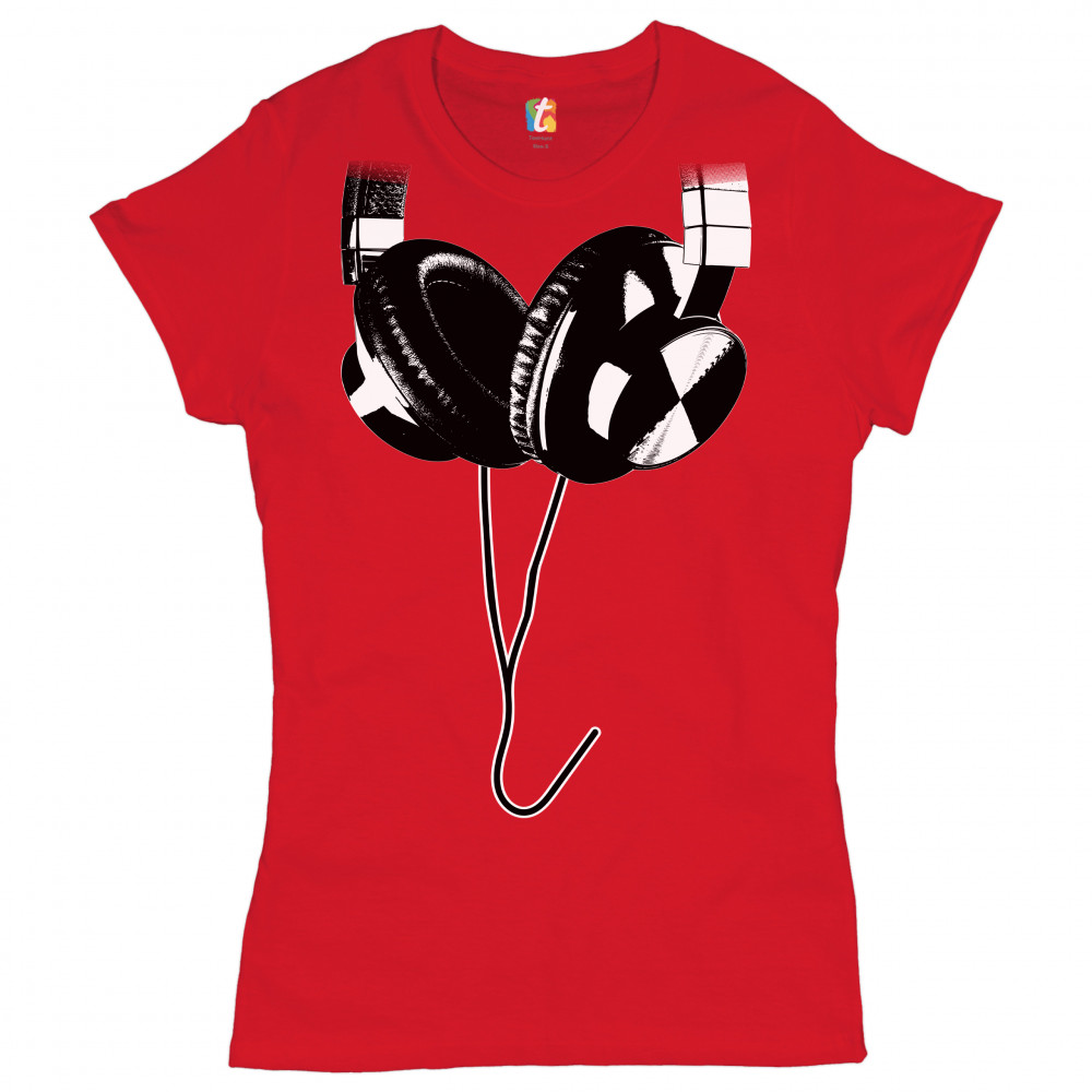 HUGE HANGING HEADPHONES t-shrit dj music women's tee red