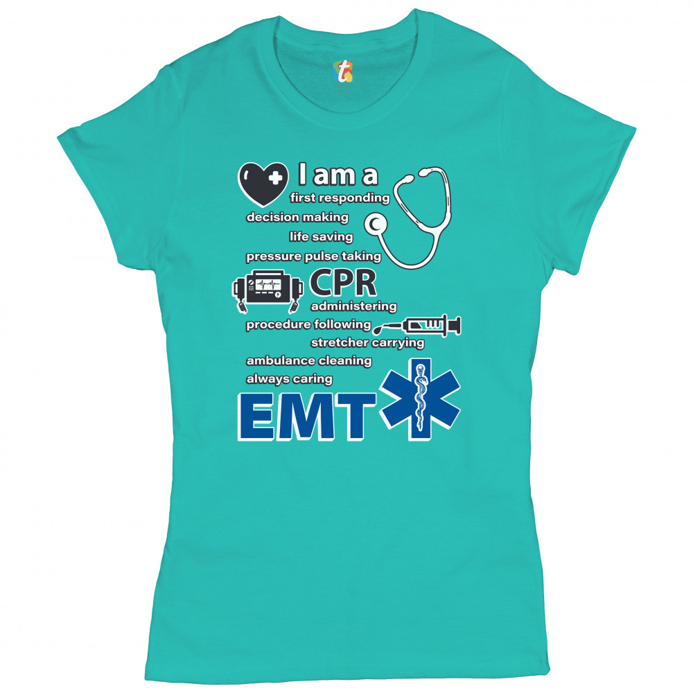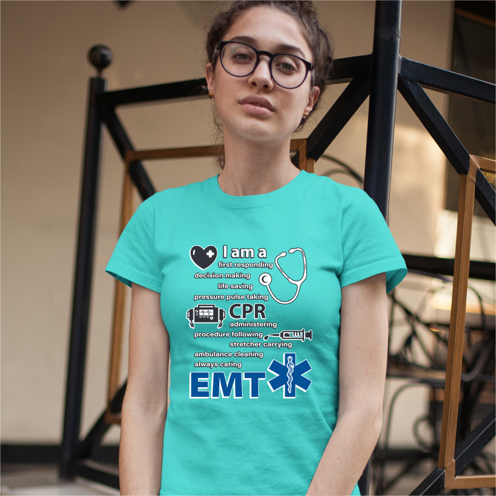 A print saying "I am a first responding, decision making, life saving, pressure pulse taking, CPR administering, procedure following, stretcher carrying, ambulance cleaning, always caring EMT". The print also features images of a heart, a stethoscope, a defibrillator, a syringe and the Star of Life. A great choice as a gift for a first responder.