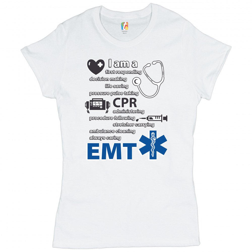 A print saying "I am a first responding, decision making, life saving, pressure pulse taking, CPR administering, procedure following, stretcher carrying, ambulance cleaning, always caring EMT". The print also features images of a heart, a stethoscope, a defibrillator, a syringe and the Star of Life. A great choice as a gift for a first responder.