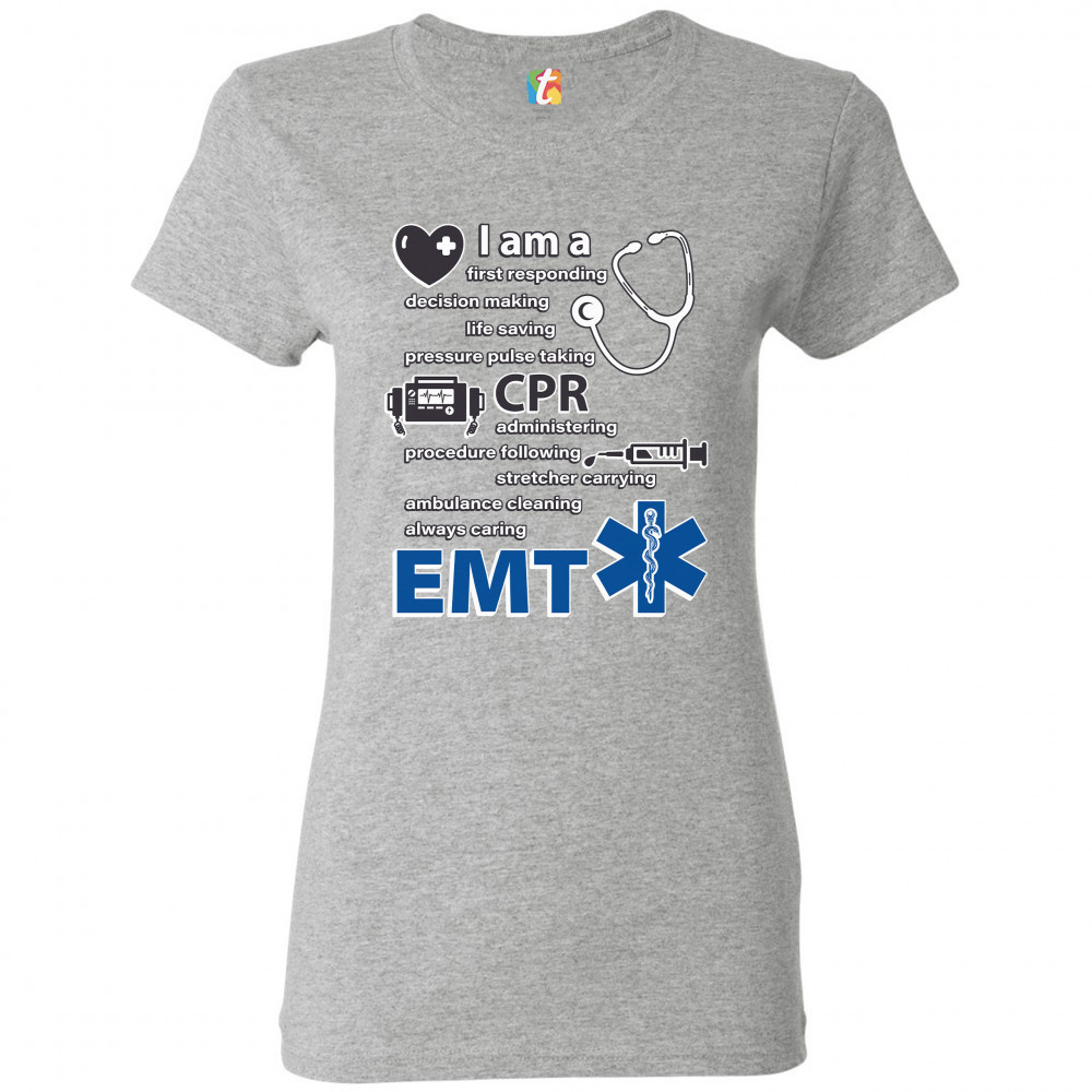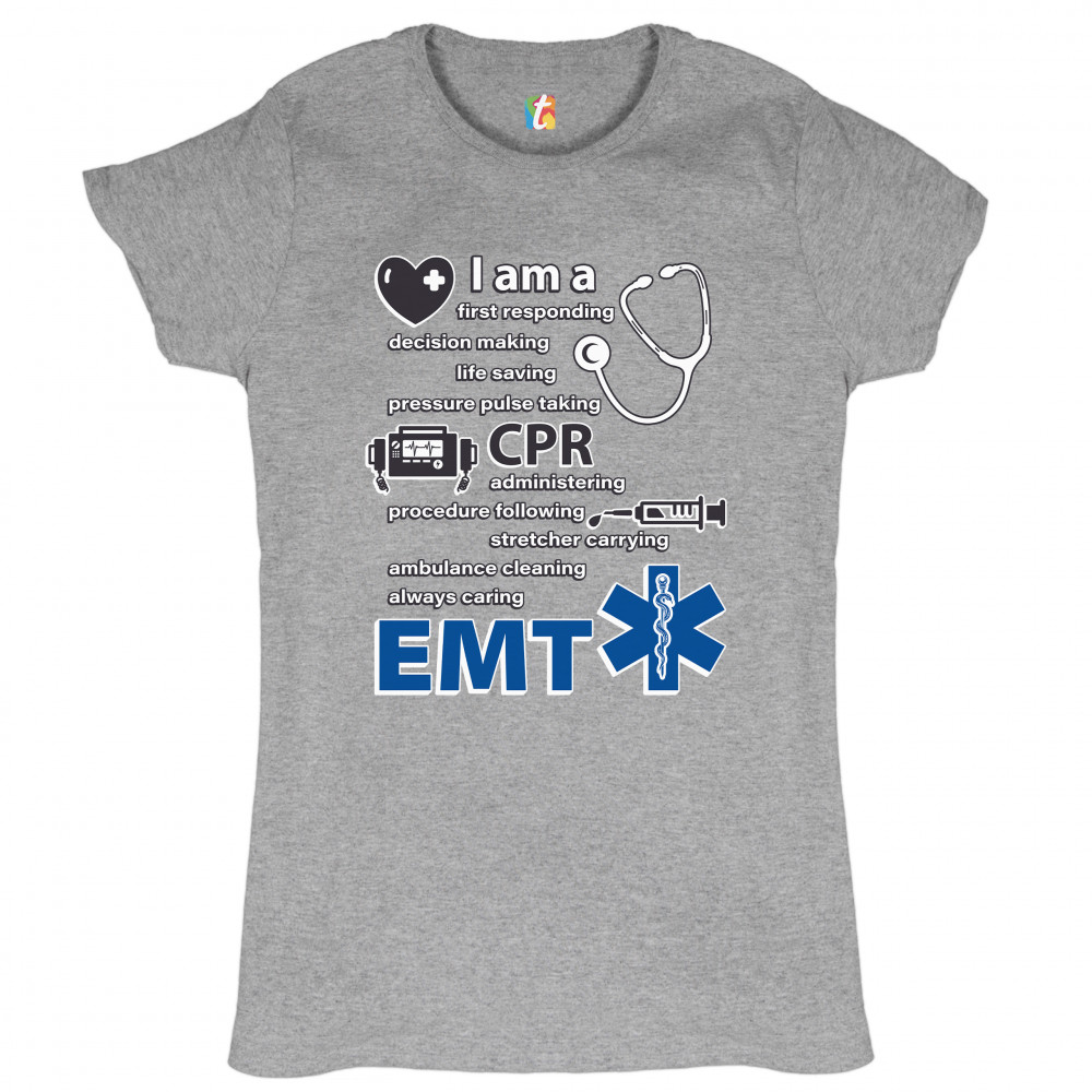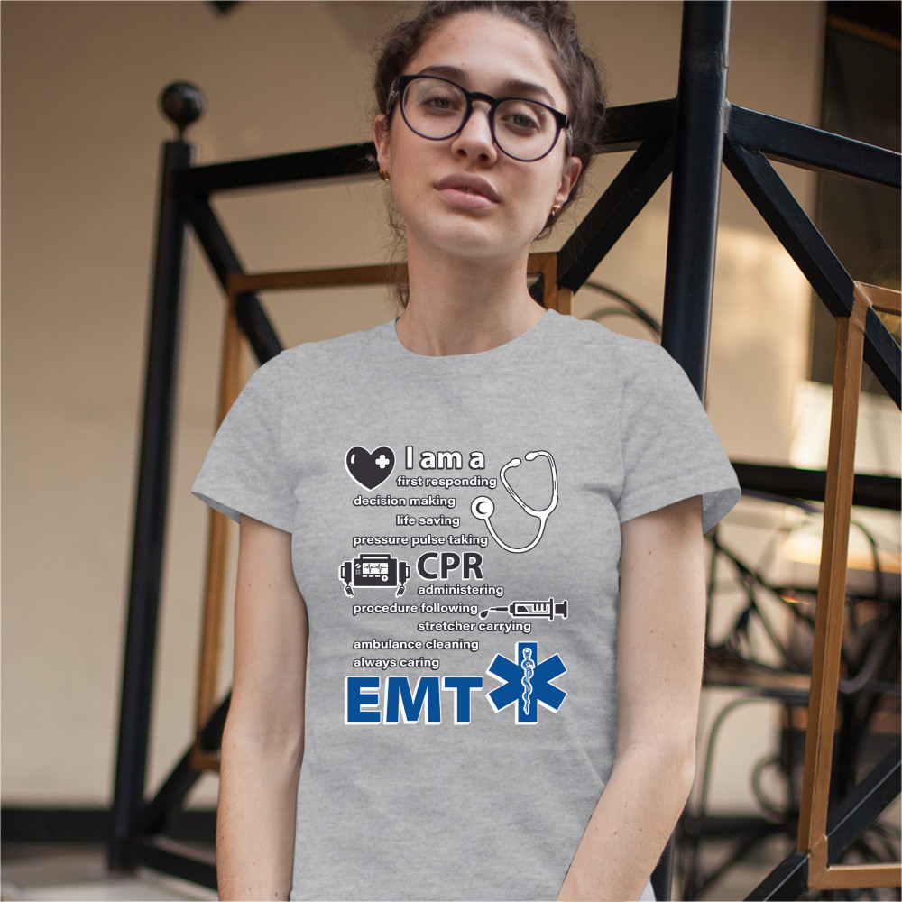 A print saying "I am a first responding, decision making, life saving, pressure pulse taking, CPR administering, procedure following, stretcher carrying, ambulance cleaning, always caring EMT". The print also features images of a heart, a stethoscope, a defibrillator, a syringe and the Star of Life. A great choice as a gift for a first responder.