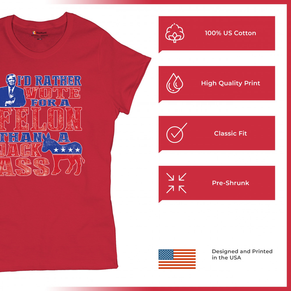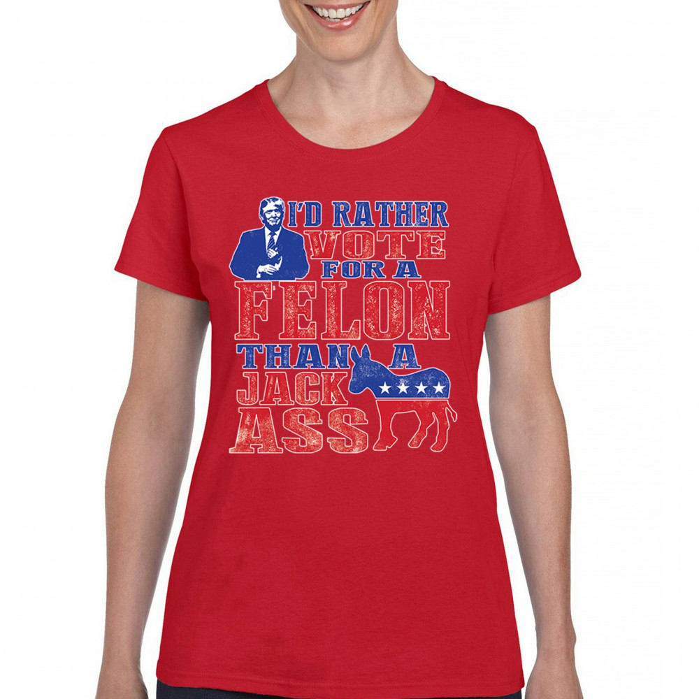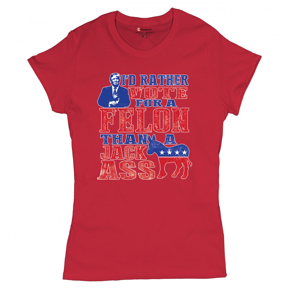 Boldly express your support with the "I'd Rather Vote For A Felon Than A Jackass" design. Perfect for rallies, it showcases loyalty to Trump and JD Vance.