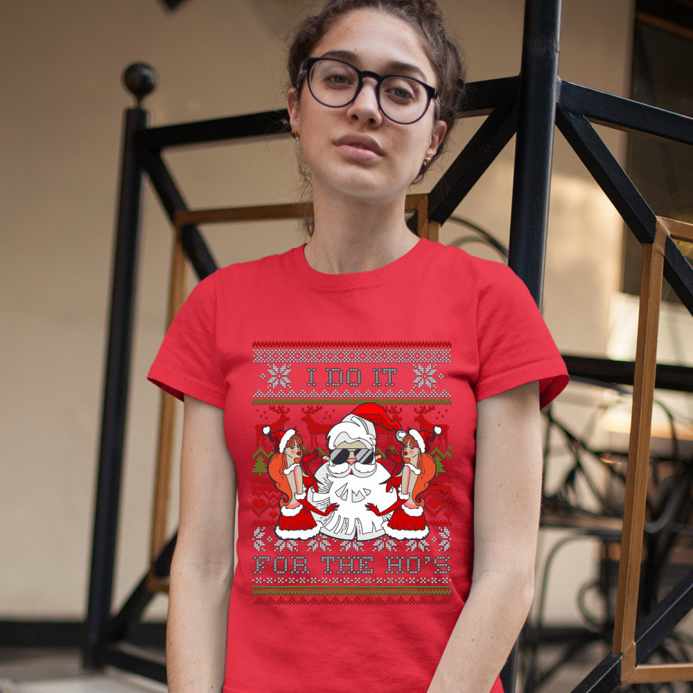 A funny print saying: "I do it for the ho's". It features a badass Santa Claus wearing sunglasses and two sexy girls in revealing Christmas outfits leaning on Santa's beard. The print is decorated wit the ugly sweater pattern in the background. Amazing ch