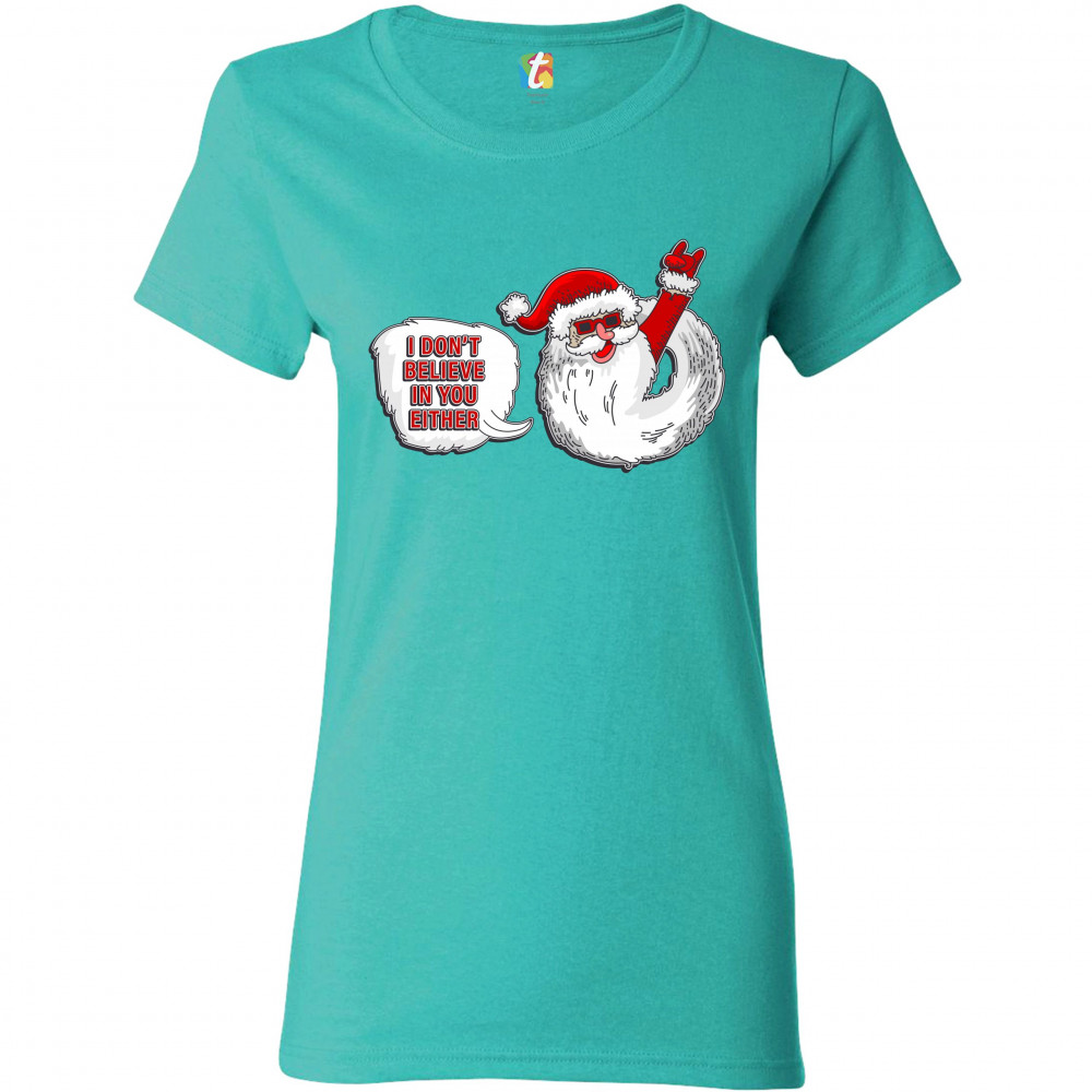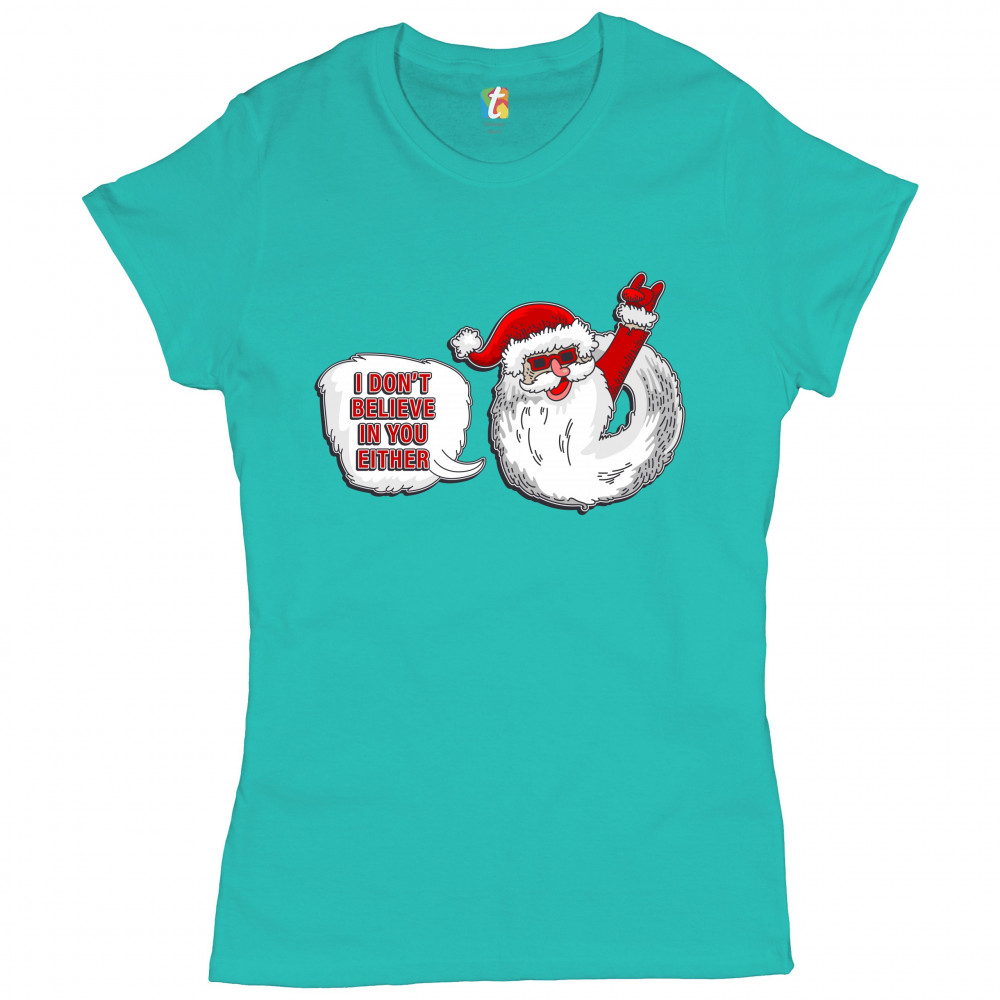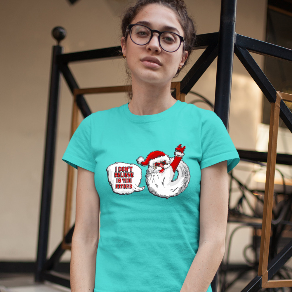 I DON'T BELIEVE IN YOU EITHER t-shirt santa claus merry christmas women's tee light blue