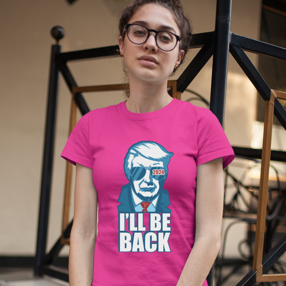 A print saying "I'll Be Back" and featuring the face of Donald Trump wearing glasses, with "2024" inside of one of the lenses. A great choice to wear to a Trump rally or give as a gift to a Donald Trump supporter before 2024 presidential elections.