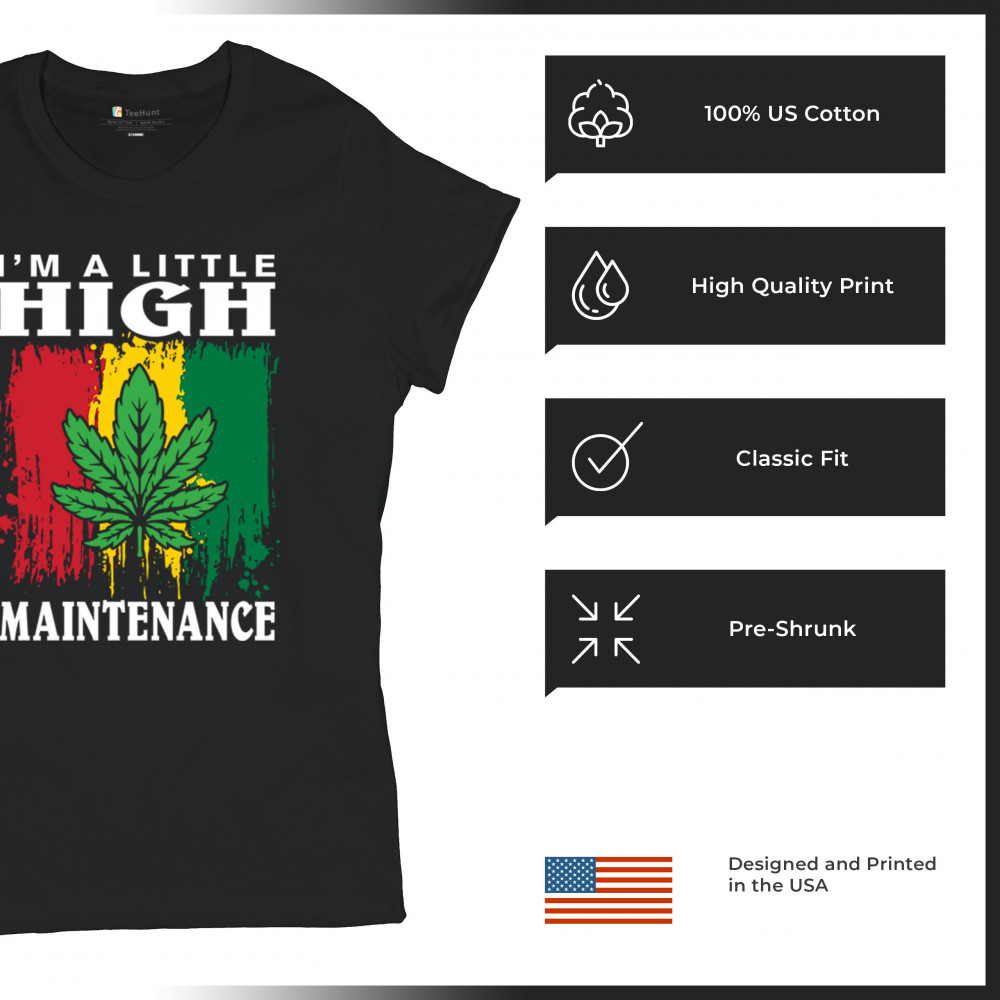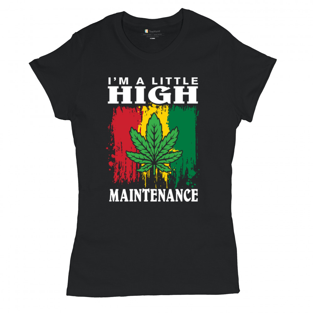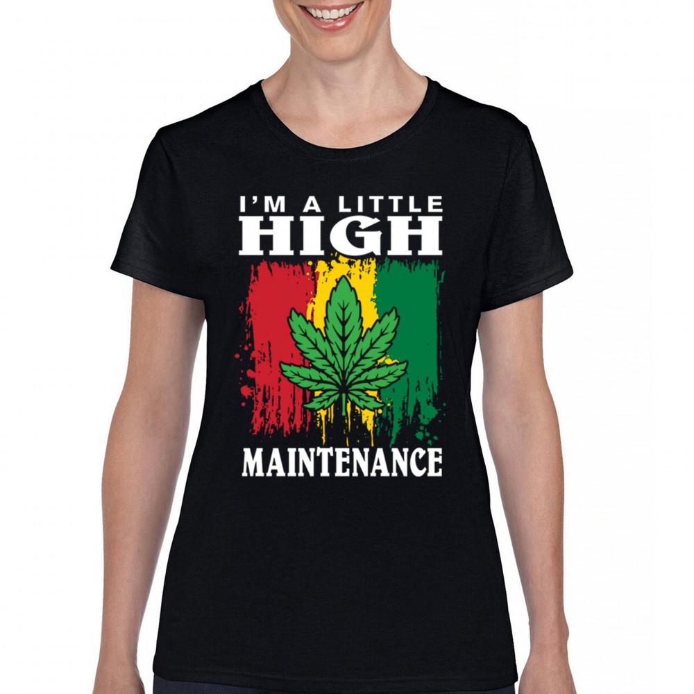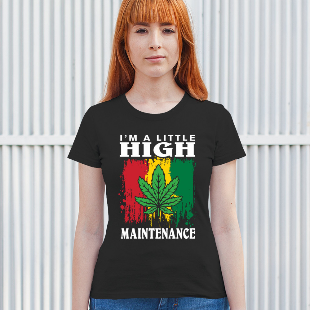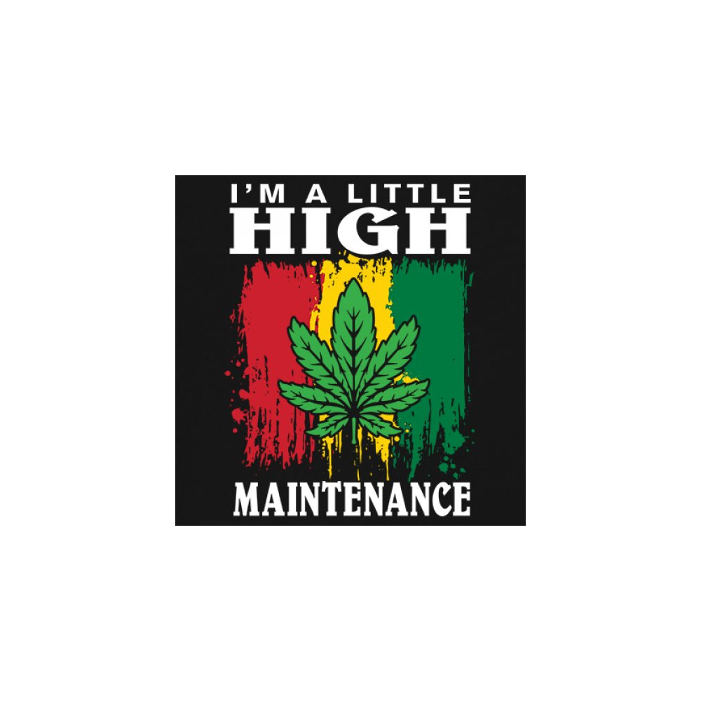 "I'm a Little High Maintenance" design with a bold cannabis leaf and vibrant background. Perfect for fans of Mary Jane, humor, and relaxed, trippy style.
