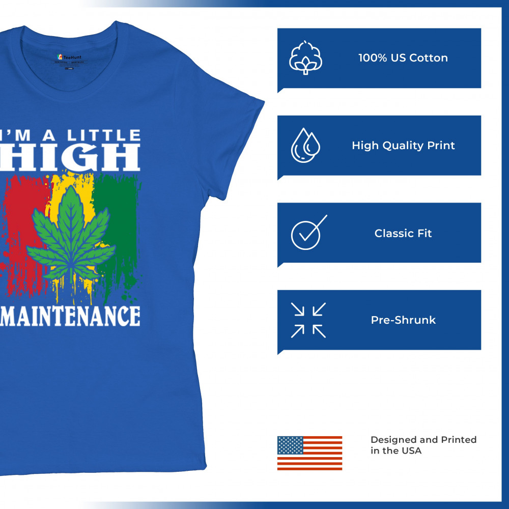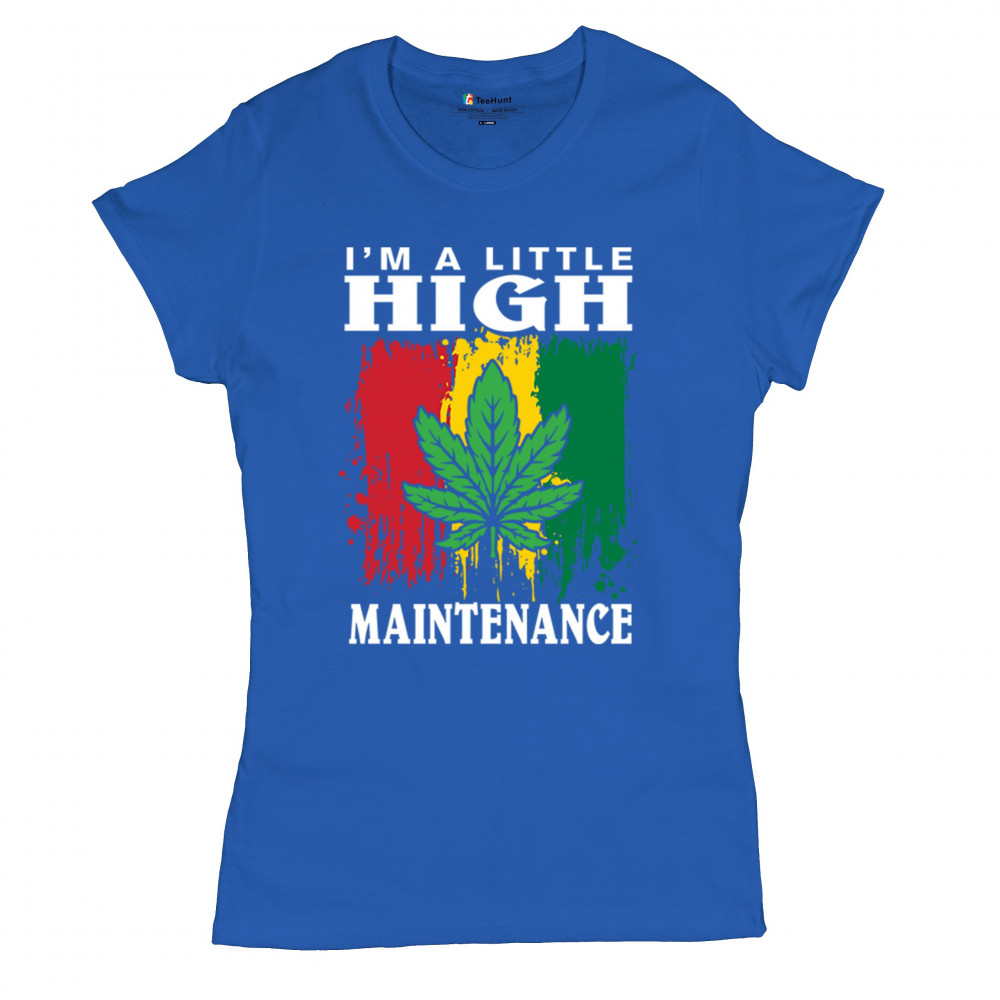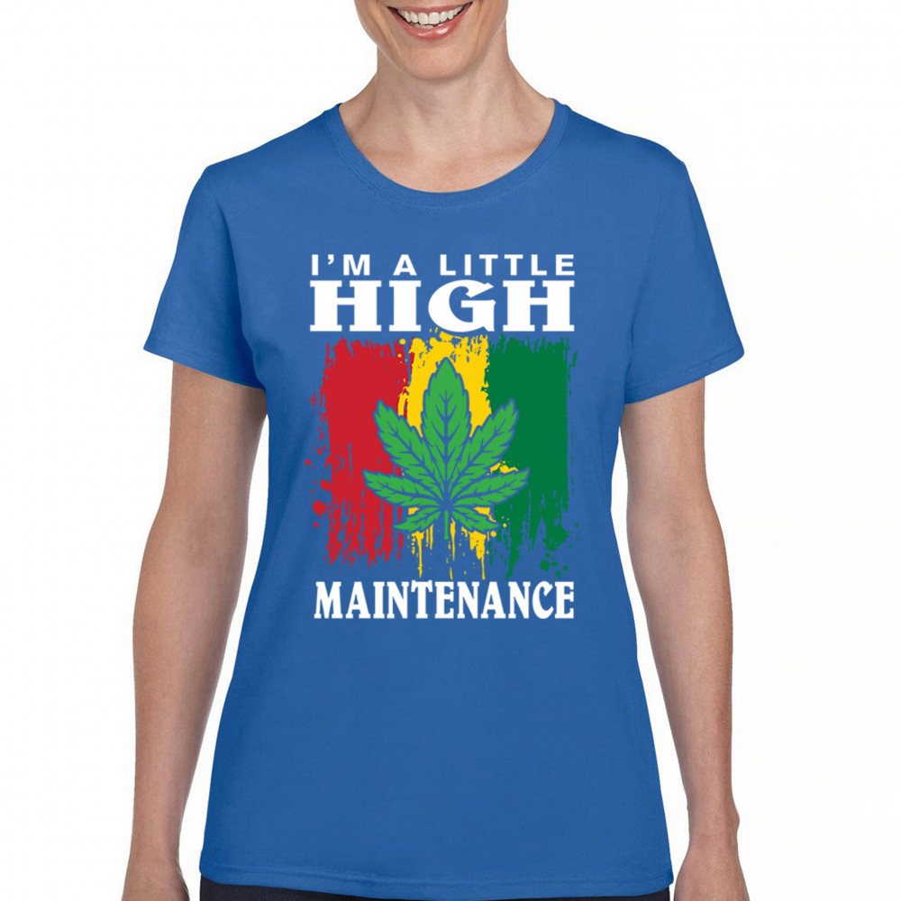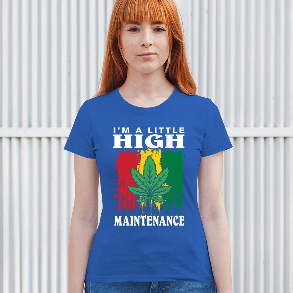 "I'm a Little High Maintenance" design with a bold cannabis leaf and vibrant background. Perfect for fans of Mary Jane, humor, and relaxed, trippy style.