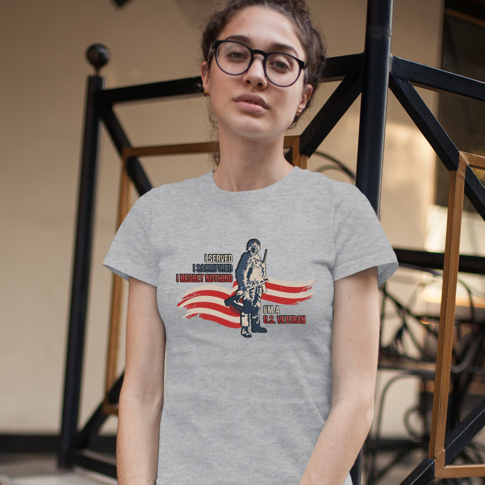 A patriotic print featuring a red-and-white stripe in the background and a soldier holding a rifle. The print says: "I Served I Sacrificed I Regreat Nothing I'm a U.S. Veteran". Great choice to wear on Independence Day or any other patriotic holiday.