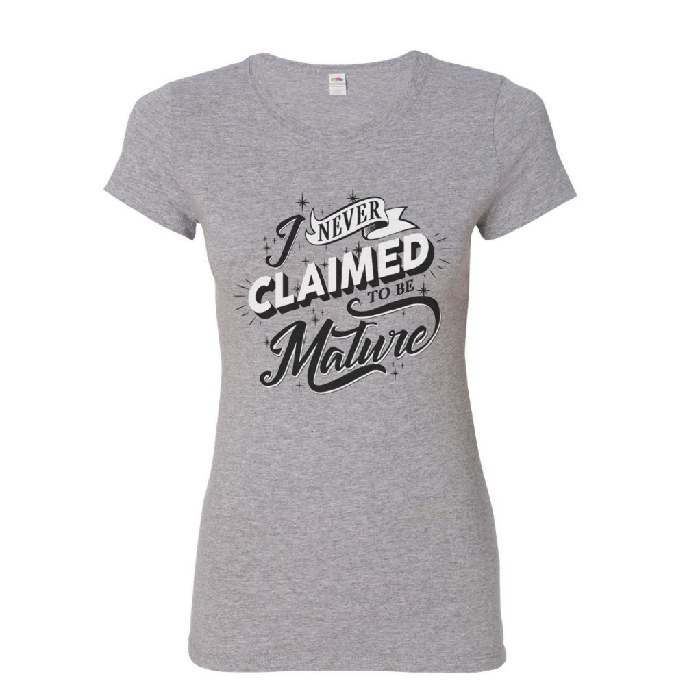 I NEVER CLAIMED TO BE MATURE women's t-shirt funny sarcastic college shirt gray