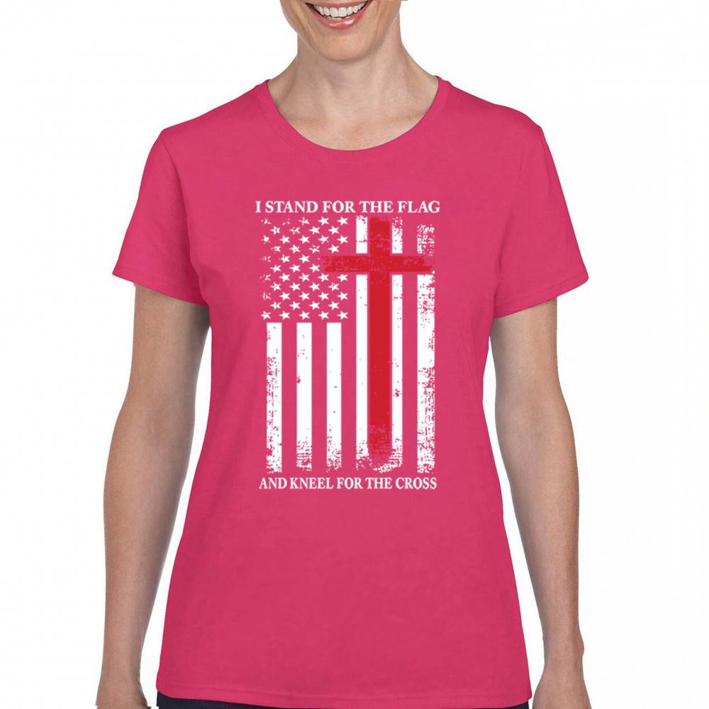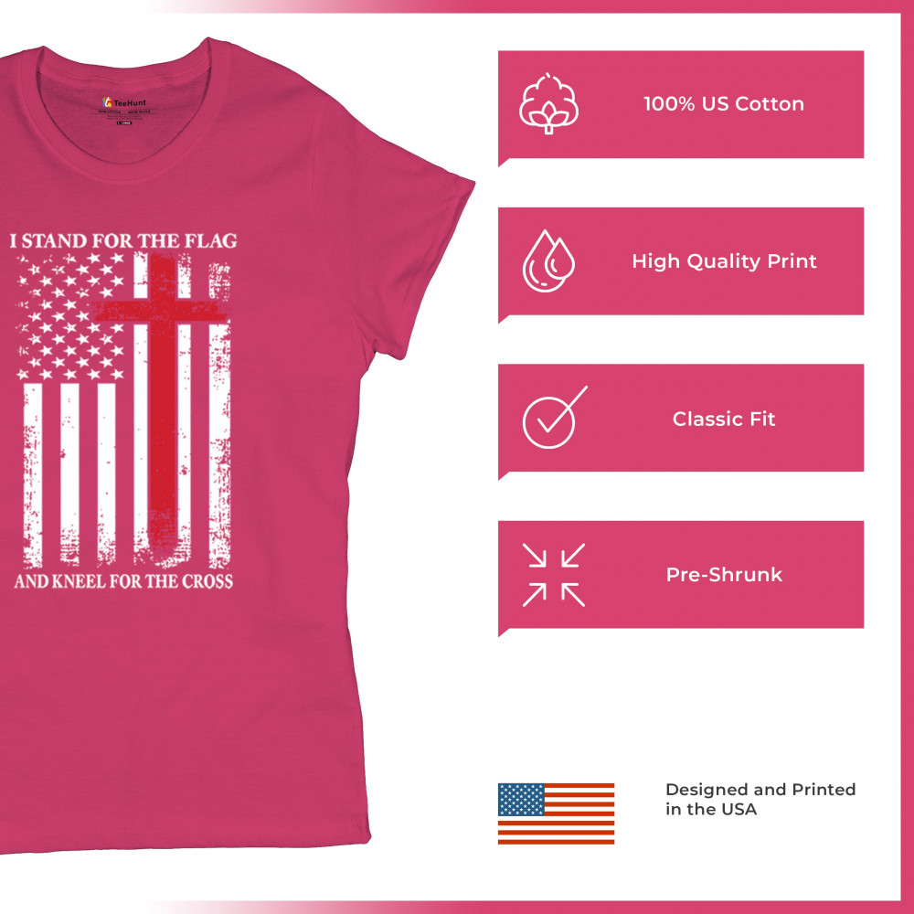 Wrap yourself in the spirit of patriotism and faith with our Stand for the Flag Kneel for the Cross design. This isn't just any Trump shirt—it's a symbol of unwavering support for American values. Featuring the iconic American flag intertwined with the Pu