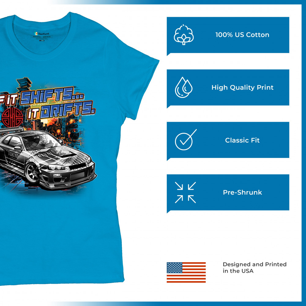 "If It Shifts, It Drifts" design. Perfect for car enthusiasts, featuring a detailed car and vibrant cityscape. Comfortable, durable, and stylish.
