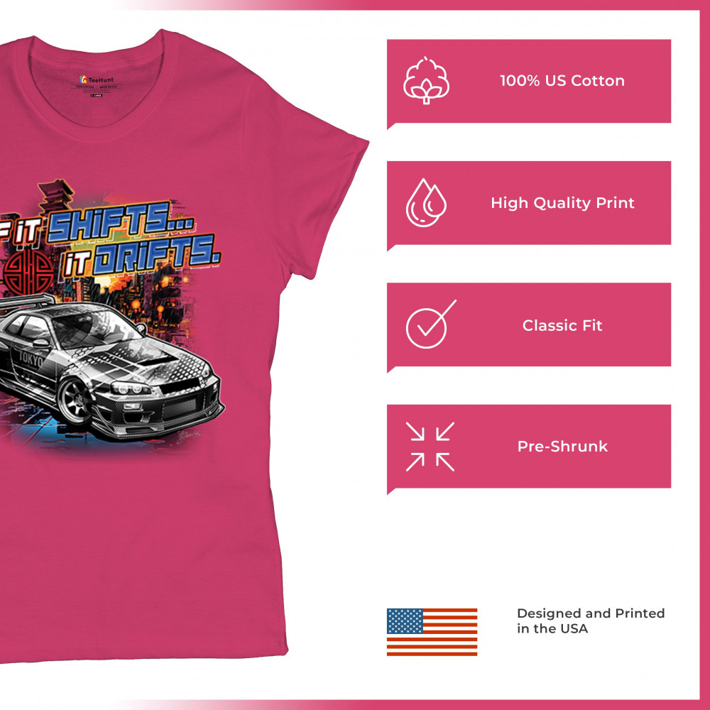 "If It Shifts, It Drifts" design. Perfect for car enthusiasts, featuring a detailed car and vibrant cityscape. Comfortable, durable, and stylish.