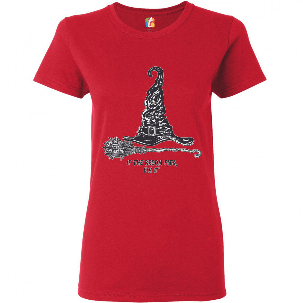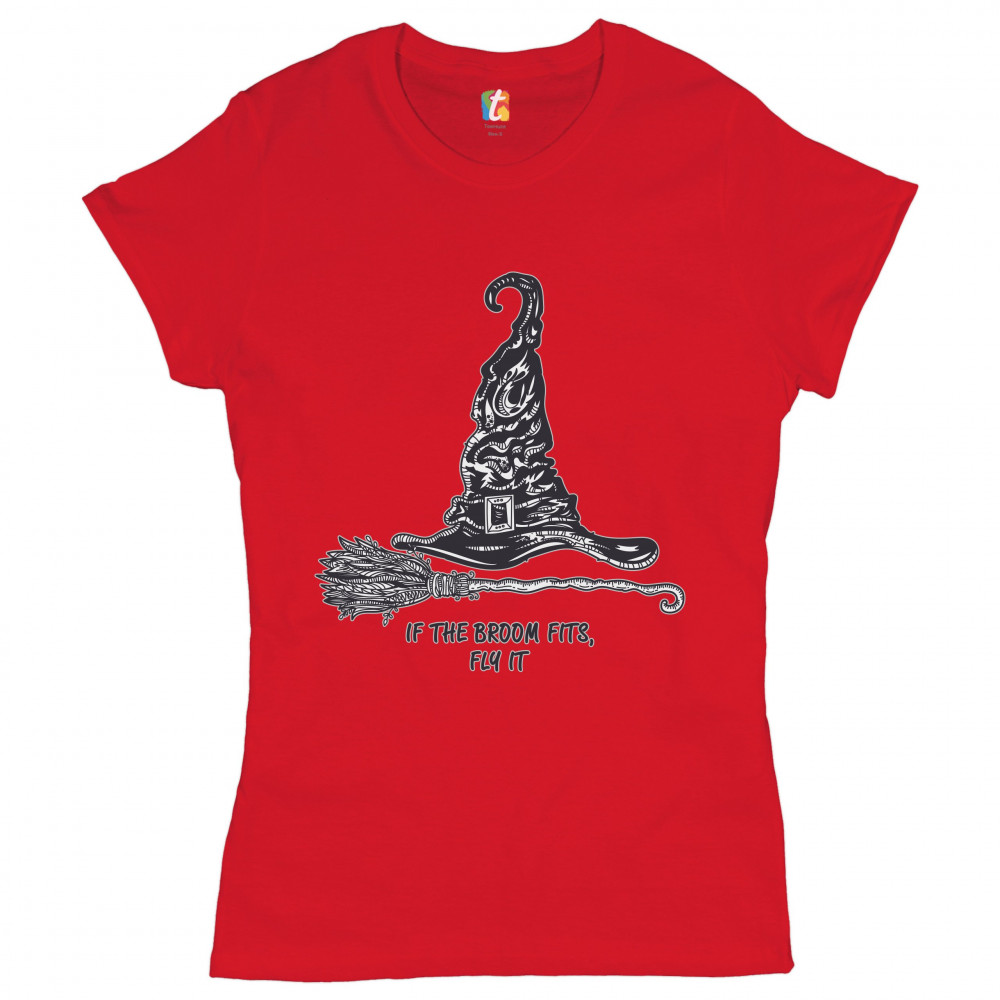 IF THE BROOM FITS, FLY IT t-shirt funny witch hat halloween women's tee red