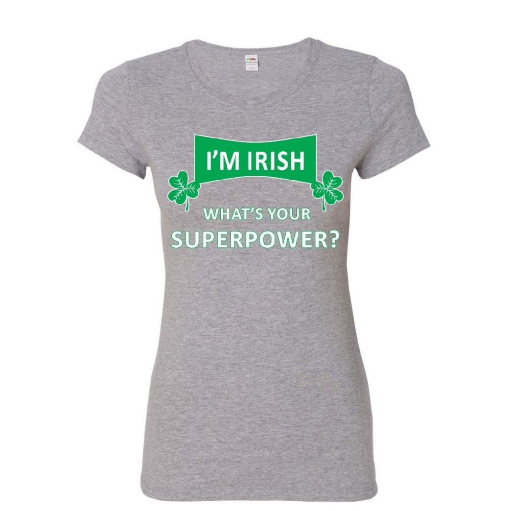 I'M IRISH WHAT'S YOUR SUPERPOWER? women's t-shirt irish shamrock clover shirt gray