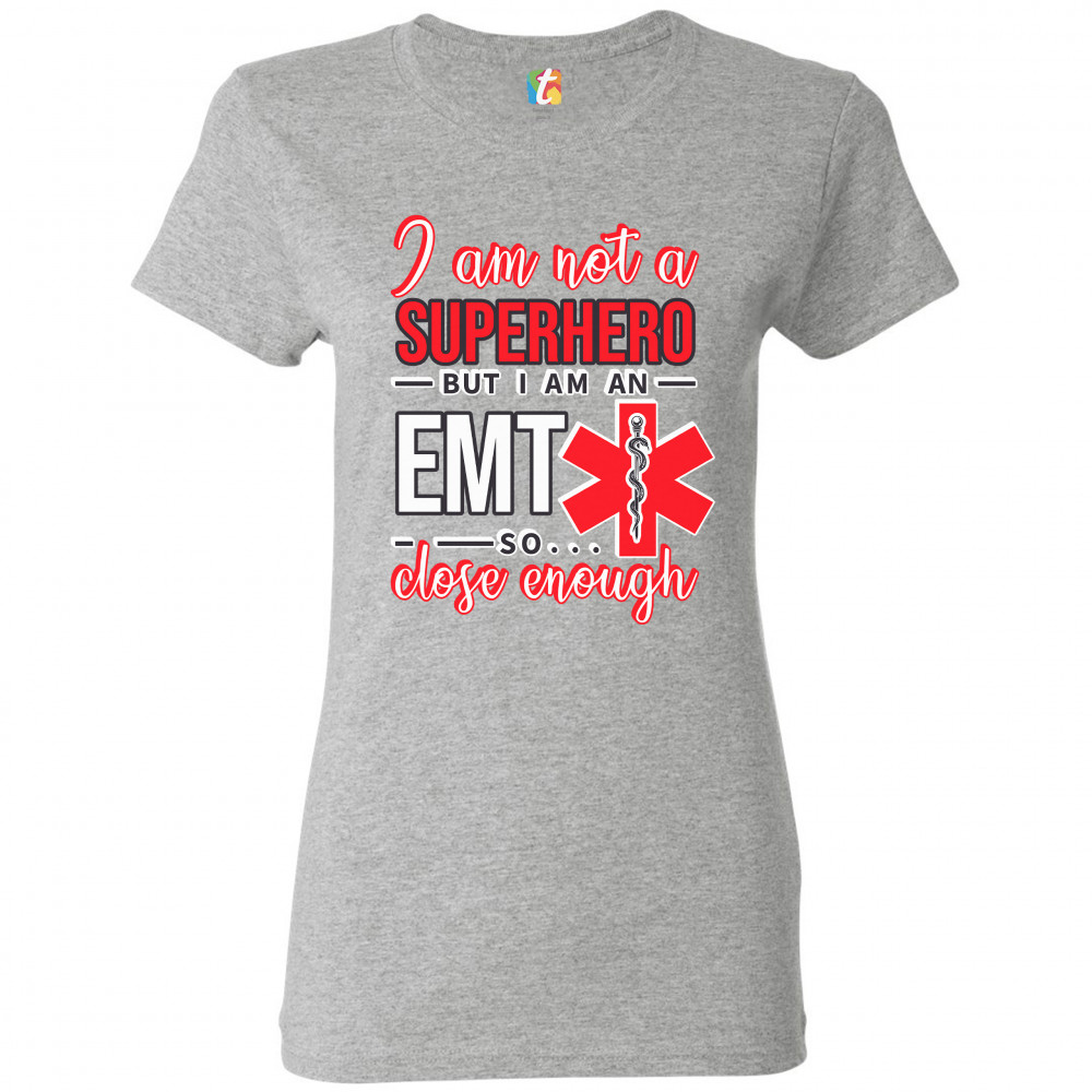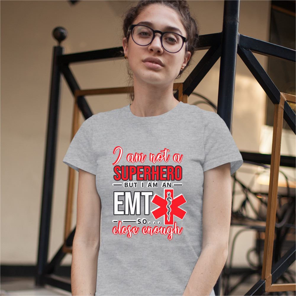 A funny print saying "I'm Not a Superhero But I'm an EMT so Close Enough". All words are written in different fonts. The print also includes the Star of Life, the worldwide recognized symbol of emergency medical services, with the Rod of Asclepius inside of it. A great choice as a gift for a first responder.