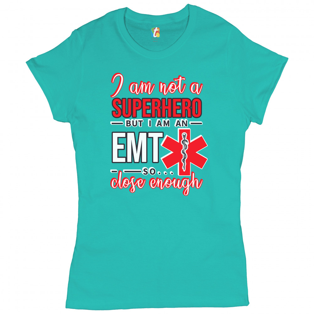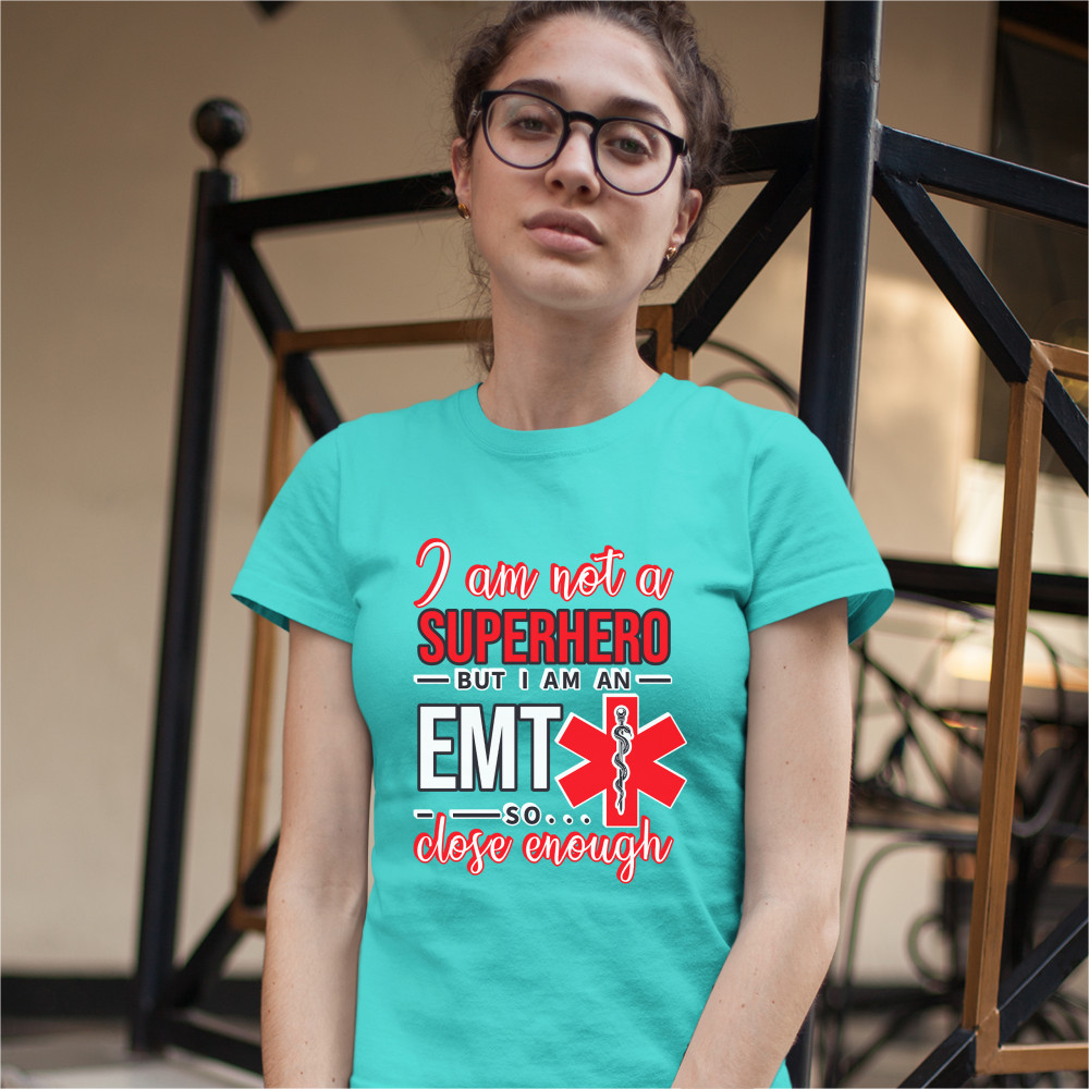 A funny print saying "I'm Not a Superhero But I'm an EMT so Close Enough". All words are written in different fonts. The print also includes the Star of Life, the worldwide recognized symbol of emergency medical services, with the Rod of Asclepius inside of it. A great choice as a gift for a first responder.