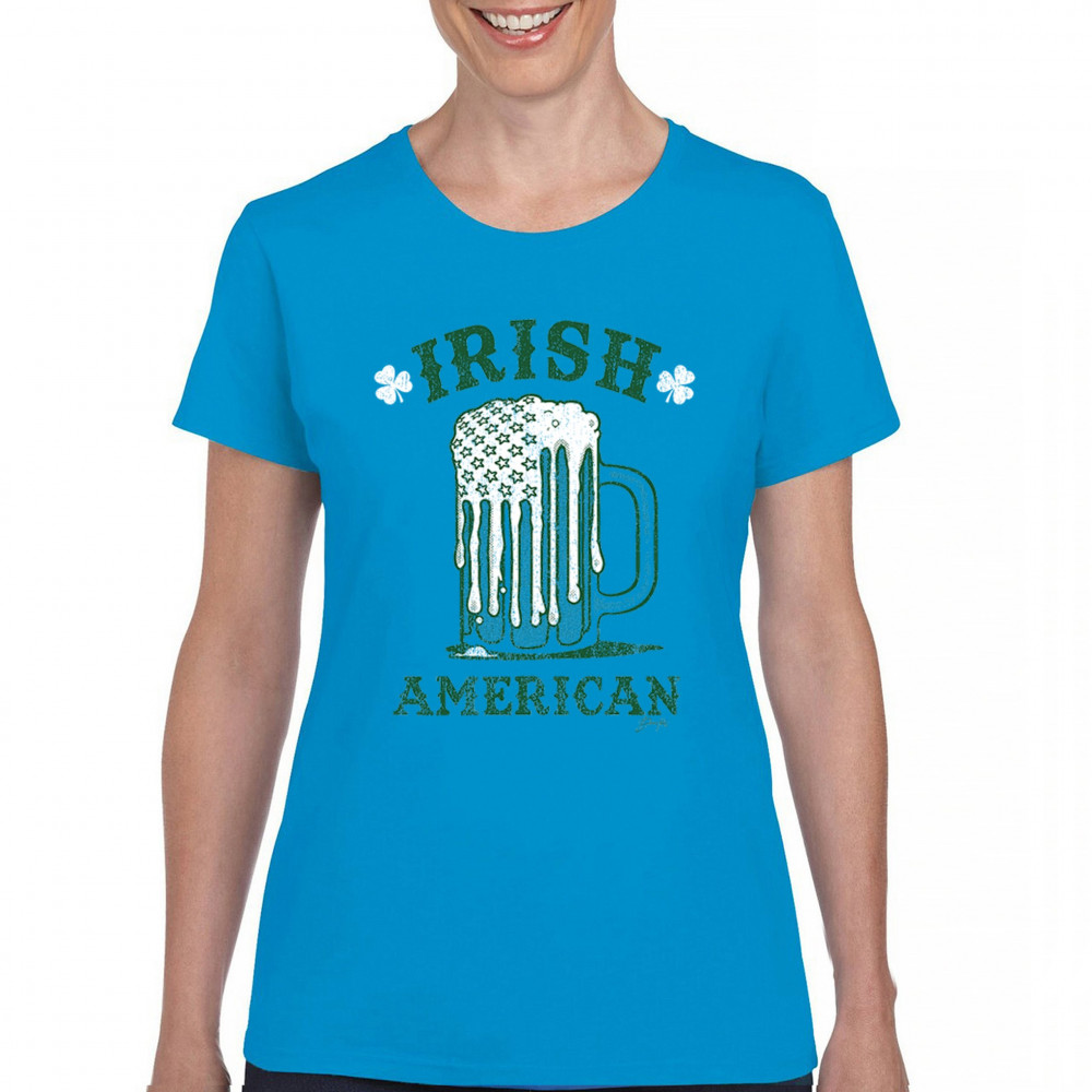 IRISH AMERICAN ST PATRICK'S DAY t-shirt shamrock shenanigans beer women's tee light blue