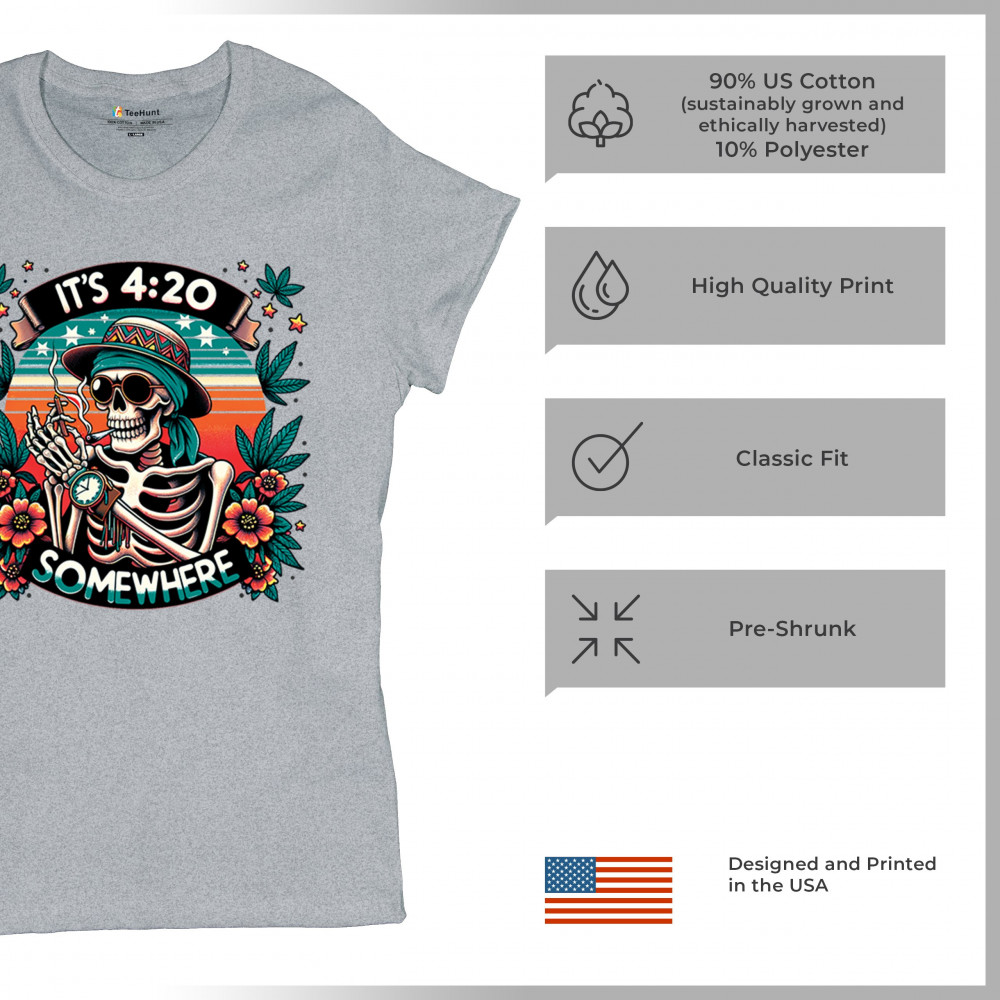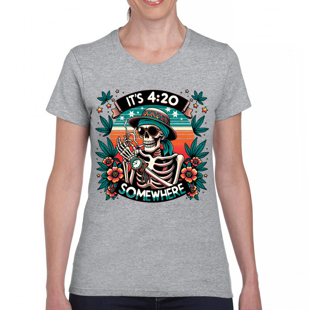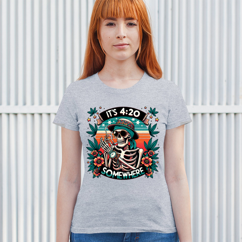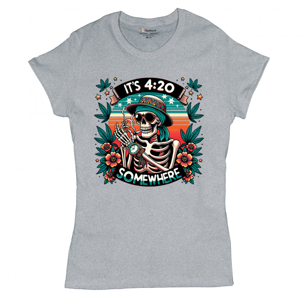 Get lifted with this “It’s 4:20 Somewhere†design featuring a joint-smoking skeleton, tropical sunset, and Deadhead stoner vibes. With bold trippy colors and beachy weed art, this tee is perfect for April 20 parties, summer festivals, and cannabis lovers living the high life.