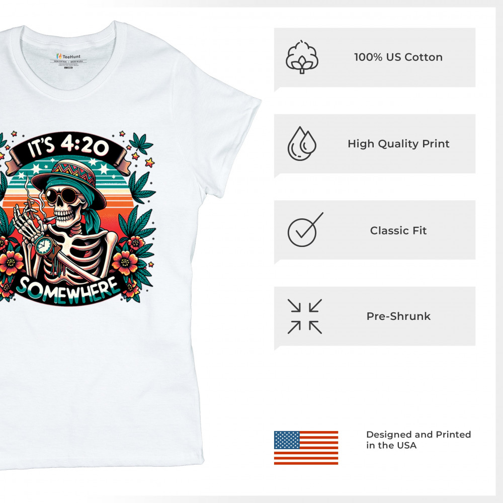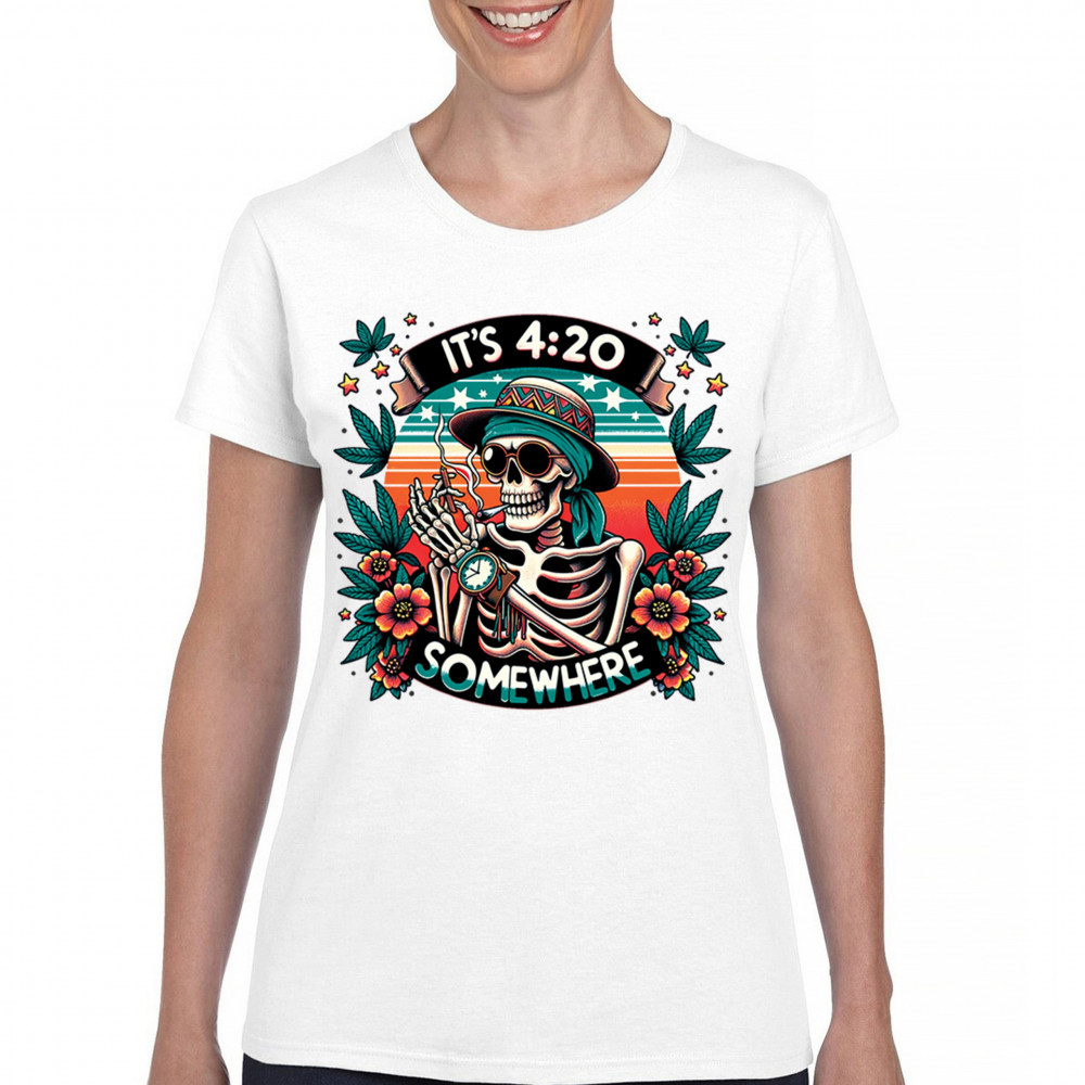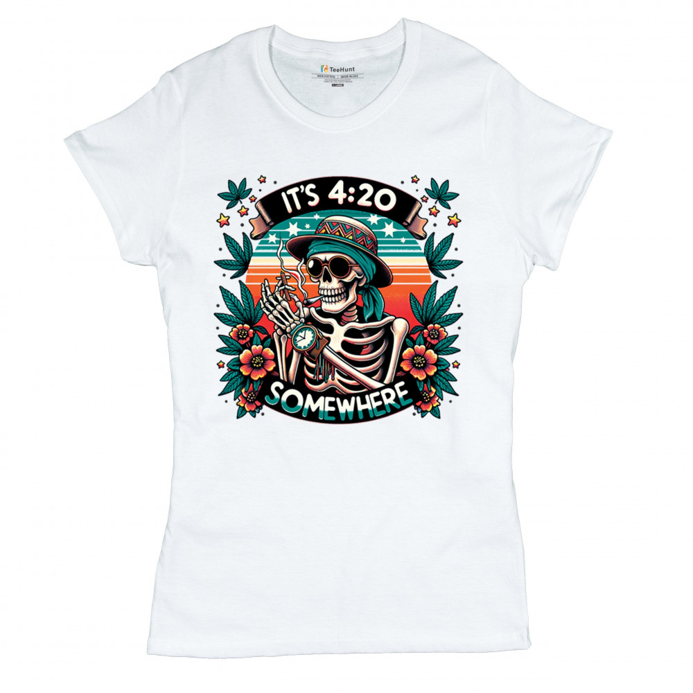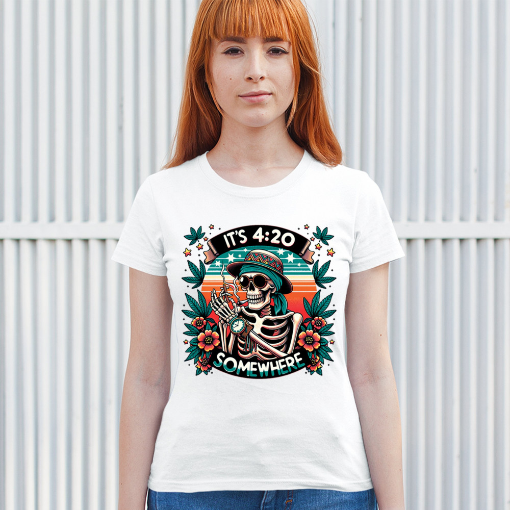Get lifted with this “It’s 4:20 Somewhere†design featuring a joint-smoking skeleton, tropical sunset, and Deadhead stoner vibes. With bold trippy colors and beachy weed art, this tee is perfect for April 20 parties, summer festivals, and cannabis lovers living the high life.