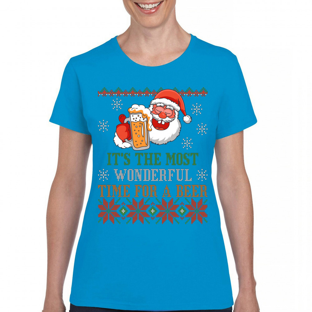 A print saying: "It's the Most Wonderful Time for a Beer" and featuring Santa Claus holding a glass of beer. The print is designed as an ugly sweater. Amazing choice for a single person who wants to make people smile and spread positive vibes on Christmas