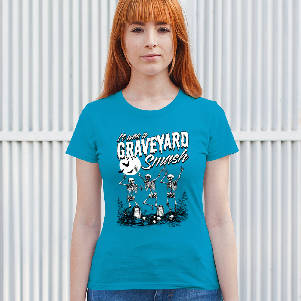Add a touch of spooky fun to your Halloween attire with this "Graveyard Smash" design, showcasing skeletons dancing under the moonlight in a graveyard. Ideal for anyone who loves Halloween, this graphic tee is perfect for parties, haunted houses, or casual trick-or-treating. Made from high-quality materials, it offers both comfort and style, ensuring you look great while embracing the festive spirit. Available in multiple sizes, this shirt is a must-have for your Halloween collection.
