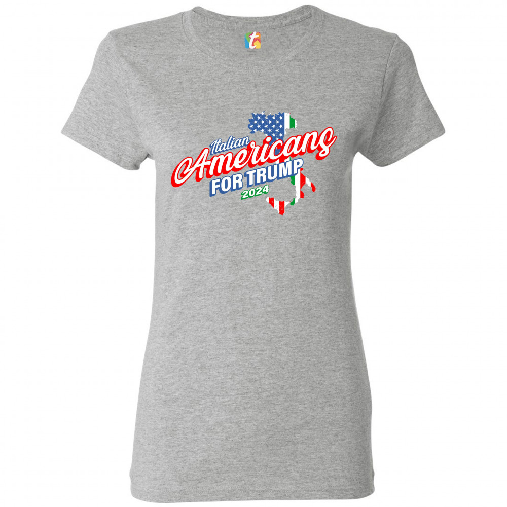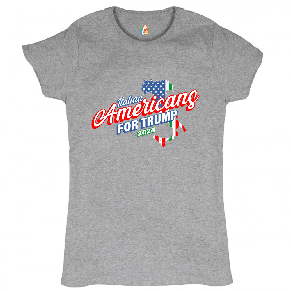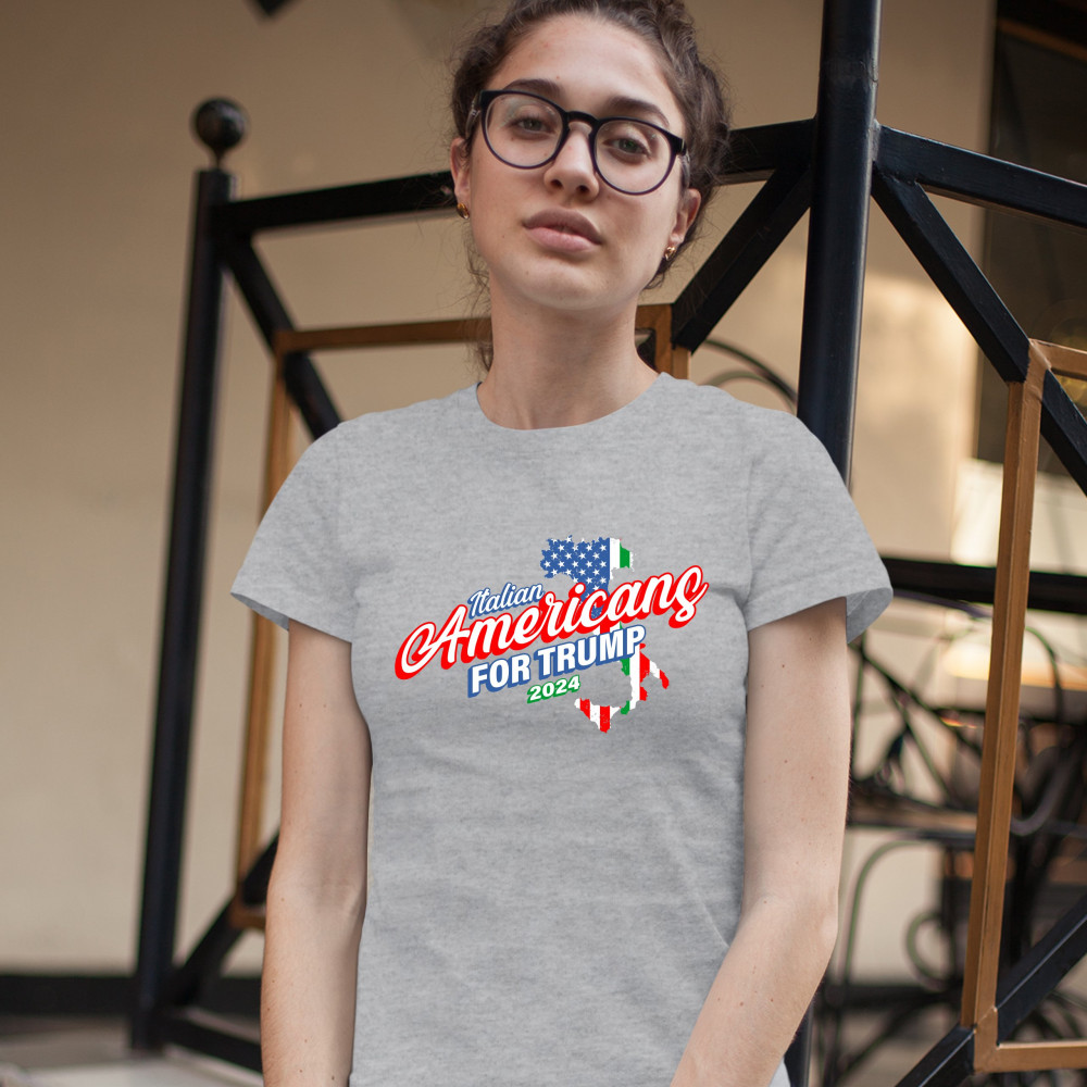 A political print saying "Italian Americans for Trump 2024". The print features a silhouette of Italy in the background with parts of the American and Italian flags inside of it. A great choice to wear for a Trump rally or give as a gift to a Donald Trump
