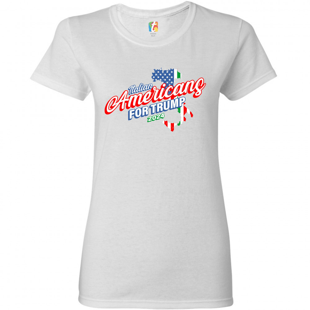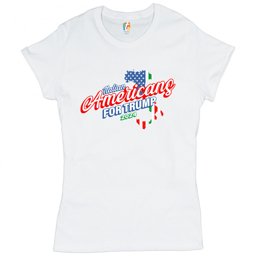 A political print saying "Italian Americans for Trump 2024". The print features a silhouette of Italy in the background with parts of the American and Italian flags inside of it. A great choice to wear for a Trump rally or give as a gift to a Donald Trump