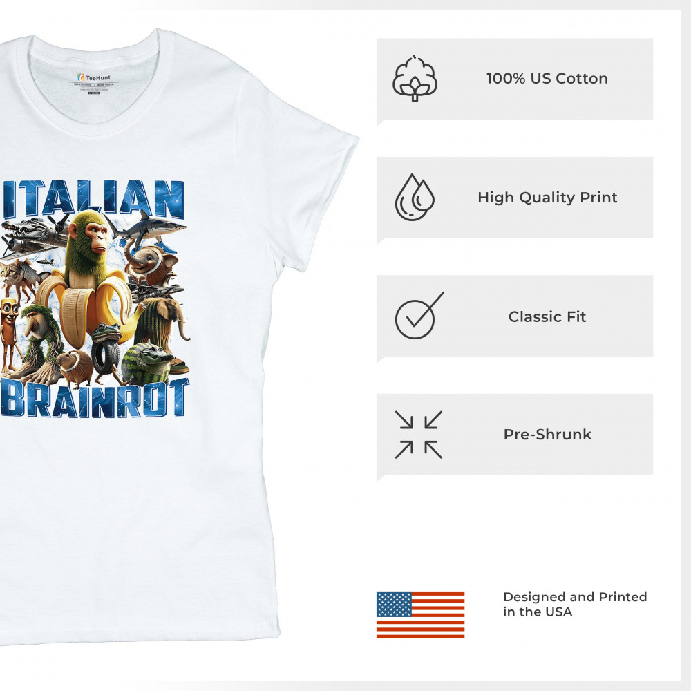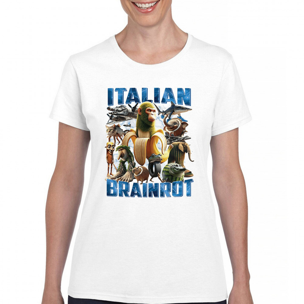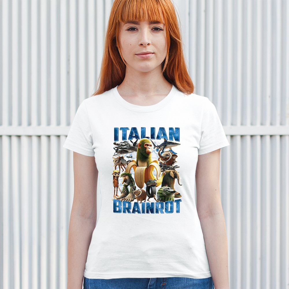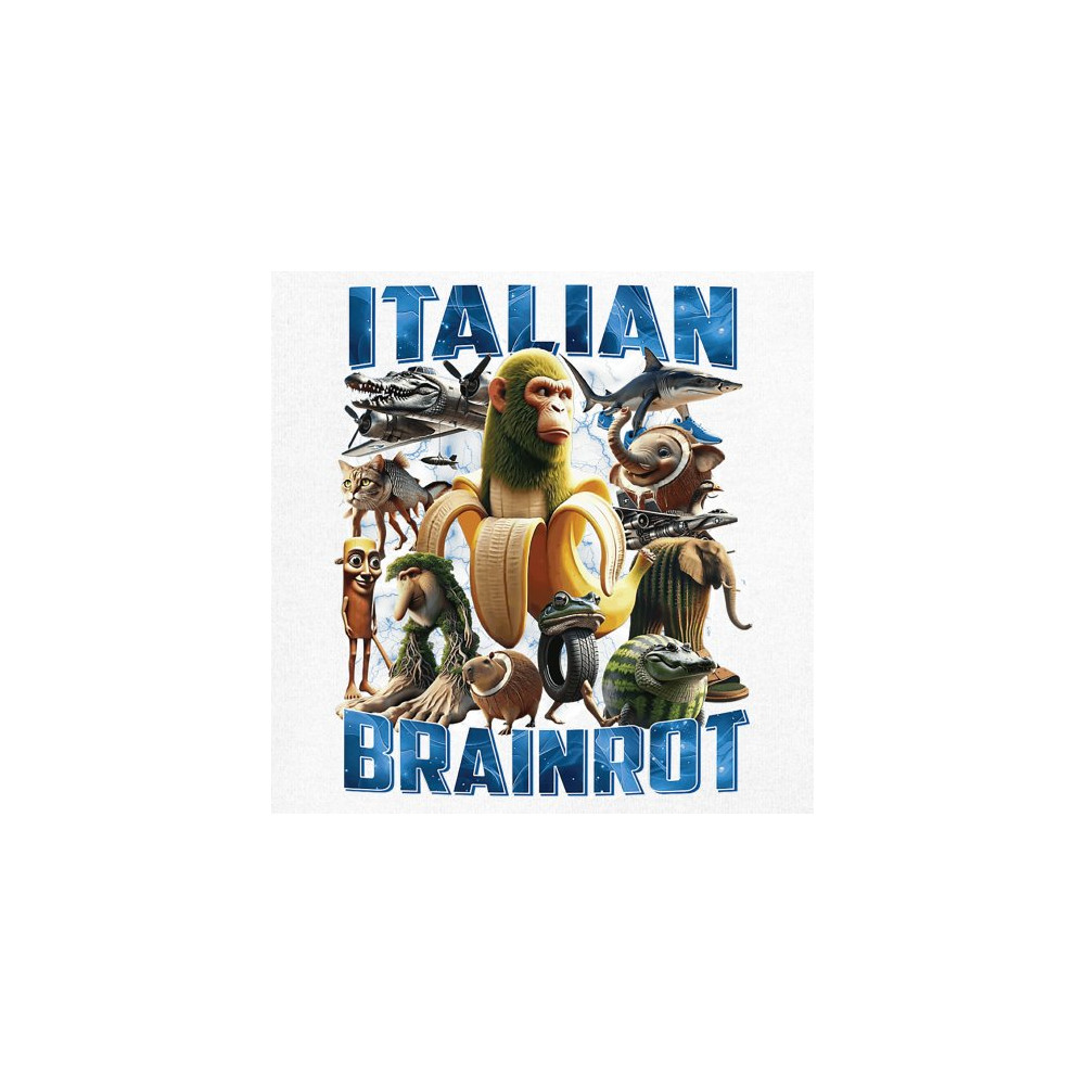 This design captures the full force of Italian brainrot—bananas, sharks, monkeys, and meme beasts collide in an unfiltered internet-core explosion. Perfect for fans of cursed humor, Gen Z trends, absurd fashion, TikTok memes, ironic style, surreal pop art, chaotic culture, digital nonsense, Gen Alpha brainrot, and hyper-online energy.