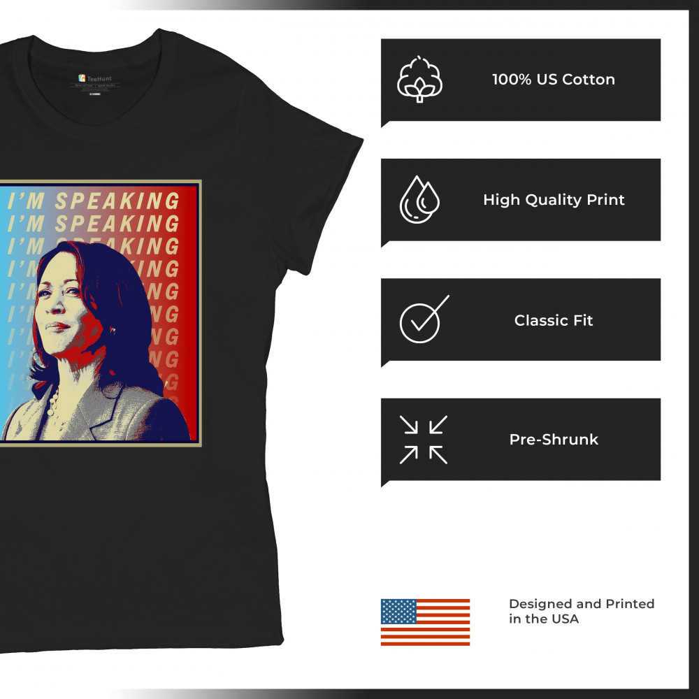 Support Kamala Harris with this bold and inspiring design. "I'M SPEAKING" echoes her powerful voice in the political arena, making it perfect for anti-Trump supporters, liberals, and Democrats. Crafted from durable materials, this design is comfortable for any event, from rallies to casual outings. Celebrate diversity and the historic candidacy of the potential first female president, resonating with black Americans, Hispanic Americans, LGBTQ supporters, and other minorities. Make a statement of hope and progress with this unique design.