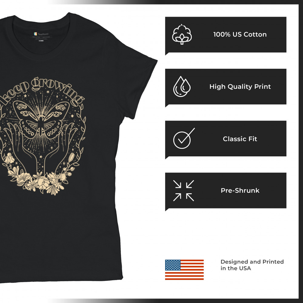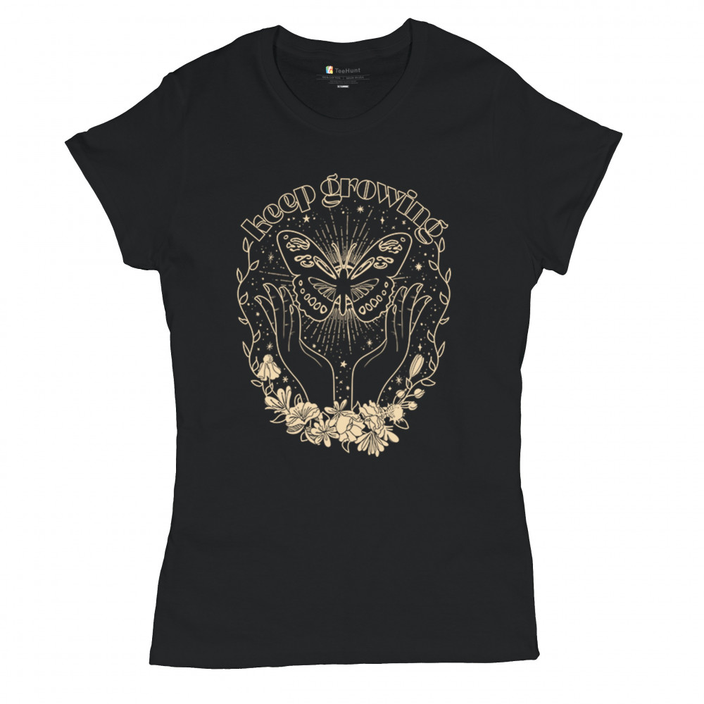 Step into your transformation with this Keep Growing design, featuring a celestial butterfly held between graceful hands and blooming flowers. A visual symbol of healing, renewal, and inner strength—perfect for journaling, meditation, yoga, or nature-inspired living. Ideal for dreamers, wellness seekers, and spiritual adventurers.