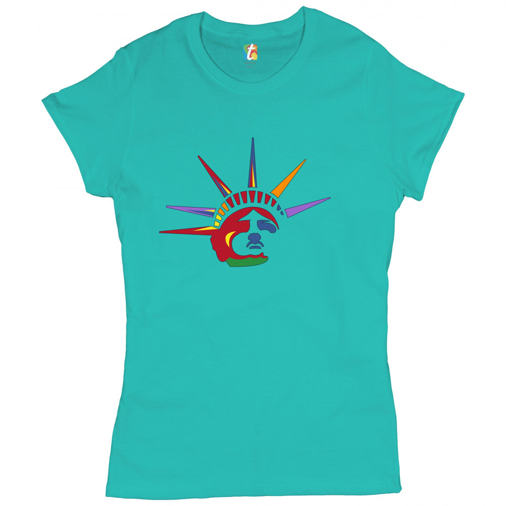 A patriotic print featuring a colorful face of the Statue of Liberty. Great choice to wear on Independence Day or any other patriotic holiday.