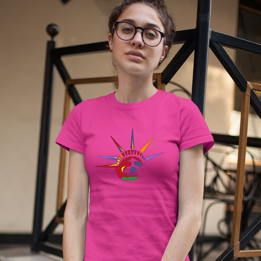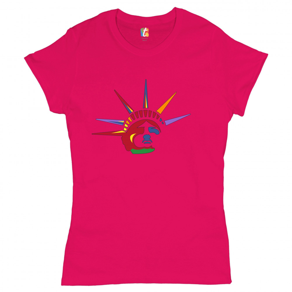 A patriotic print featuring a colorful face of the Statue of Liberty. Great choice to wear on Independence Day or any other patriotic holiday.