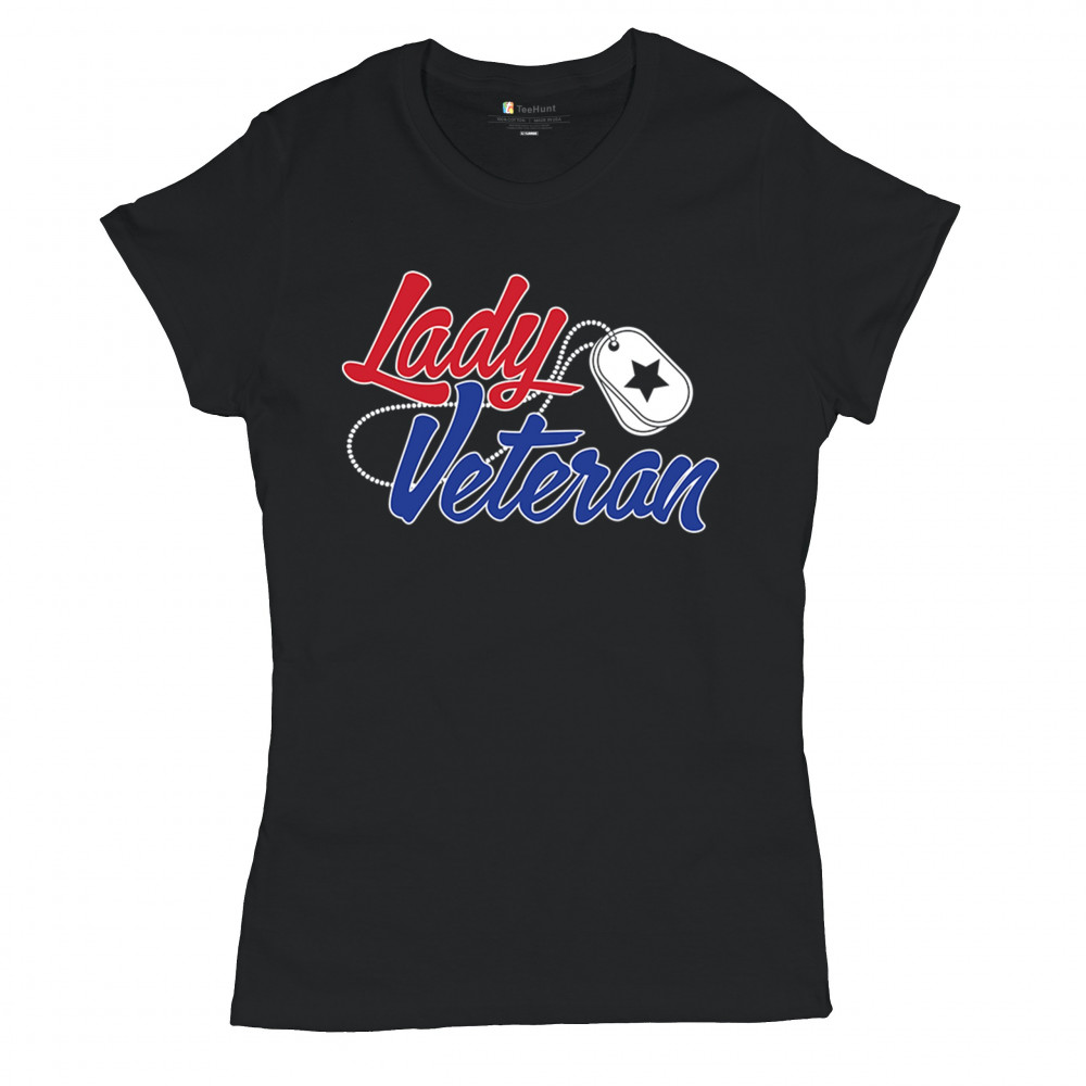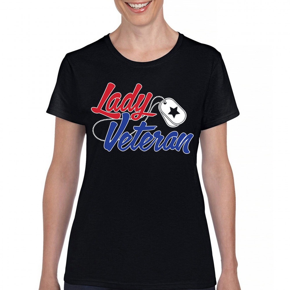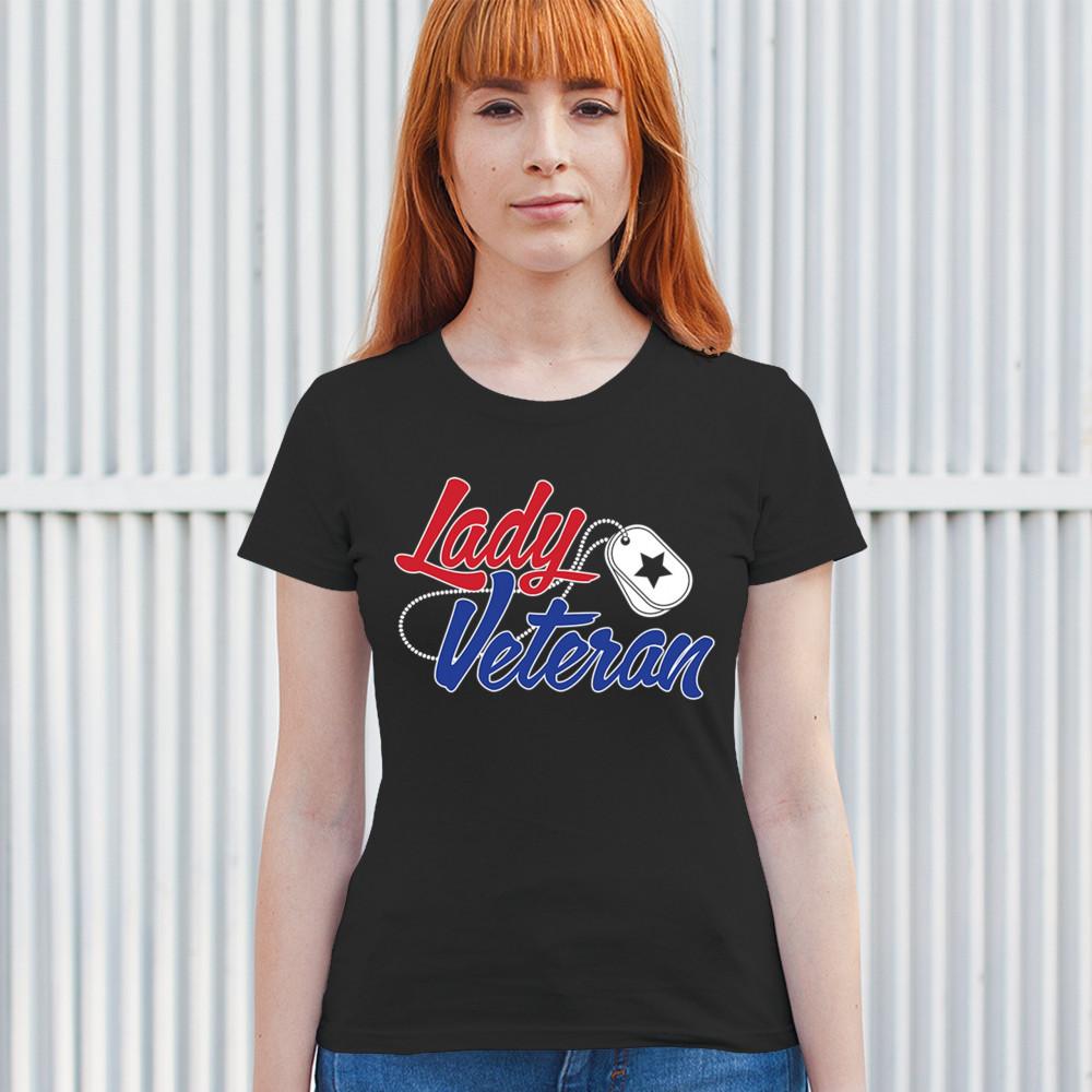 Celebrate female veterans with our "Lady Veteran" shirt. Bold red and blue design, perfect for Veterans Day and everyday wear. Honor and pride in service.