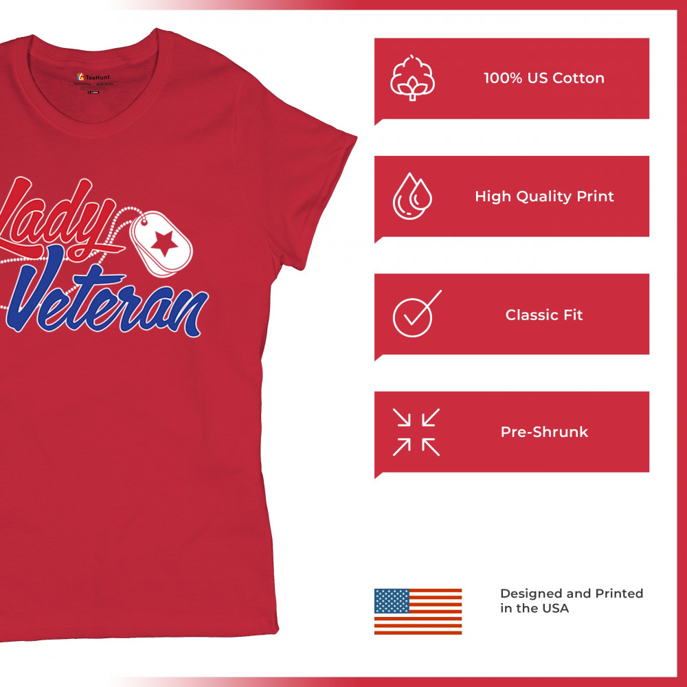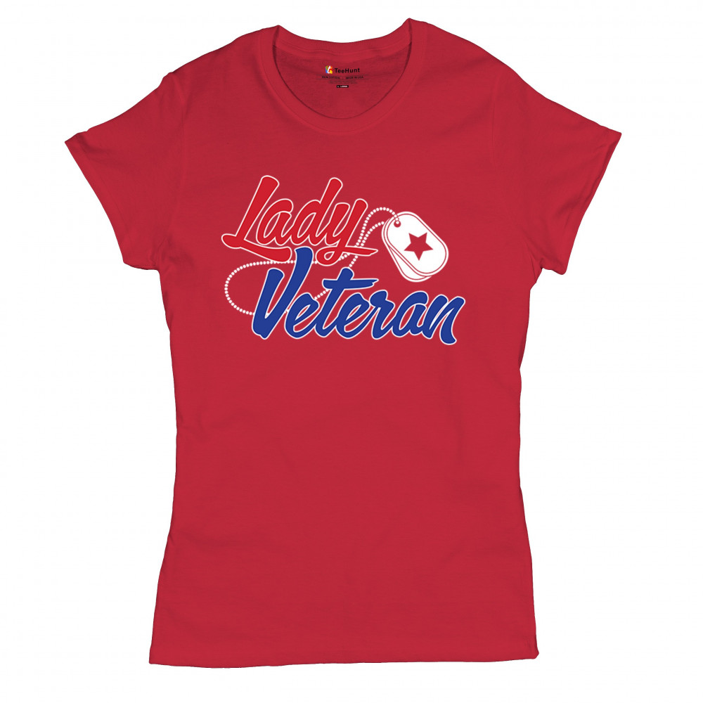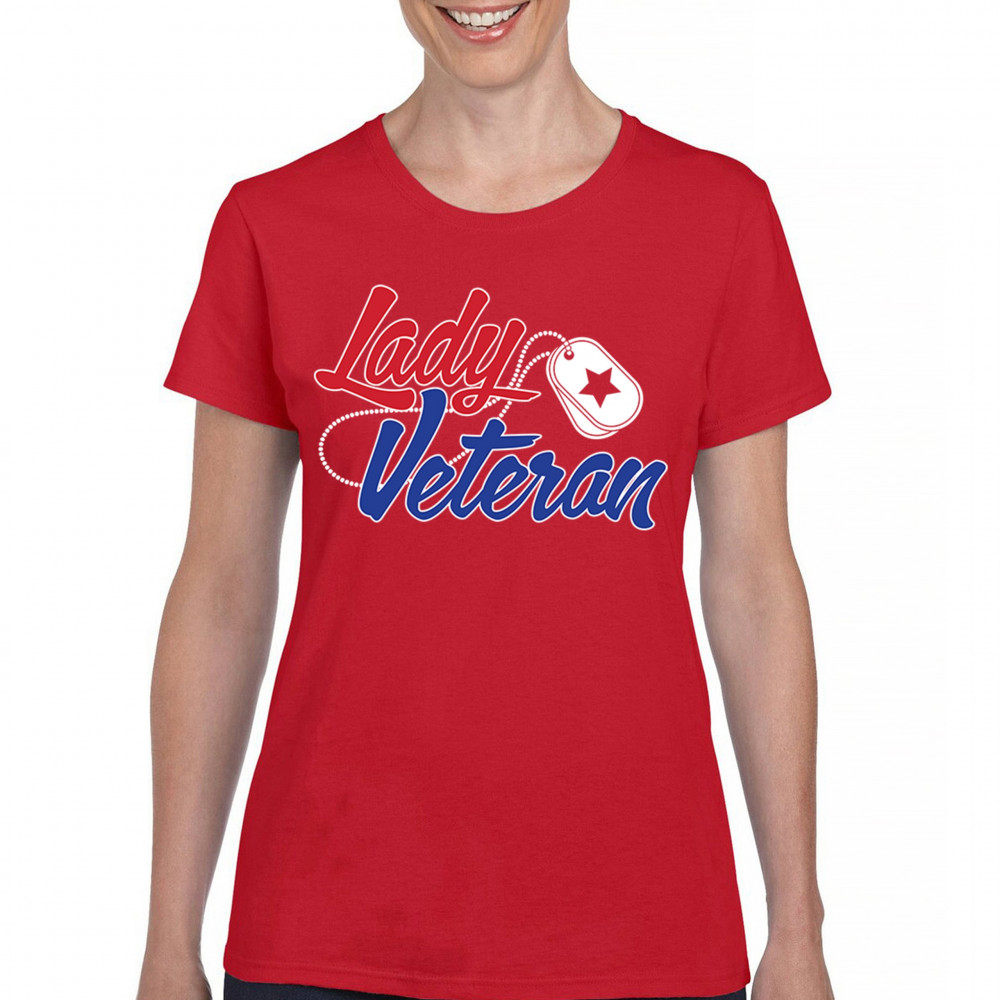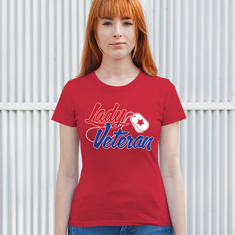 Celebrate female veterans with our "Lady Veteran" shirt. Bold red and blue design, perfect for Veterans Day and everyday wear. Honor and pride in service.