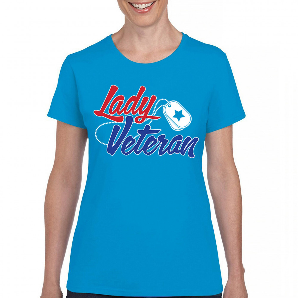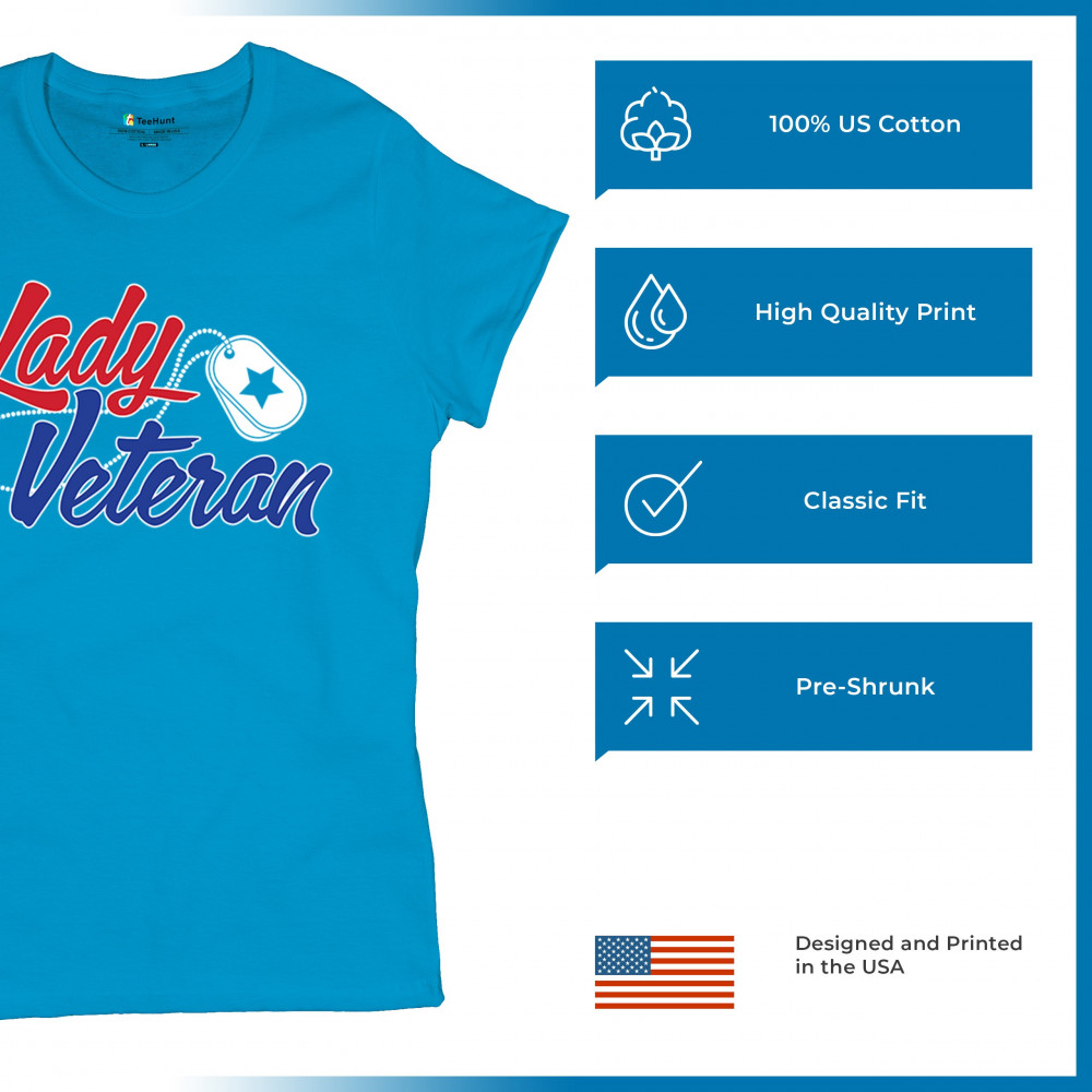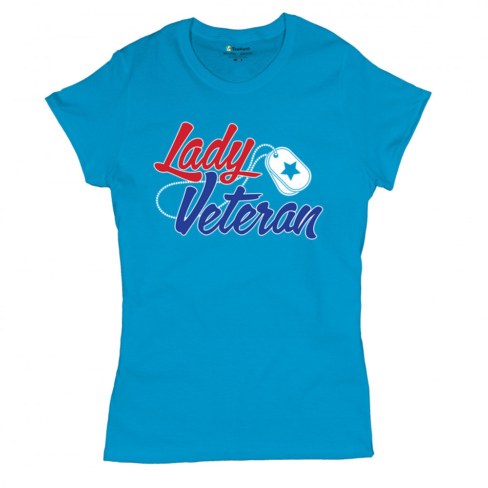 Celebrate female veterans with our "Lady Veteran" shirt. Bold red and blue design, perfect for Veterans Day and everyday wear. Honor and pride in service.