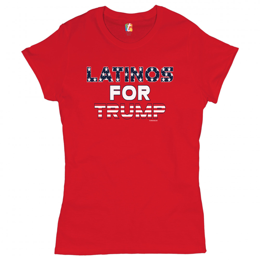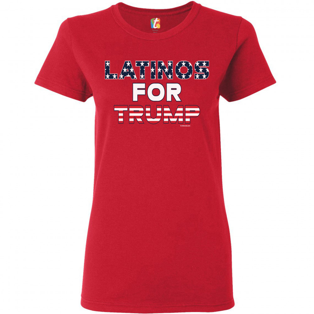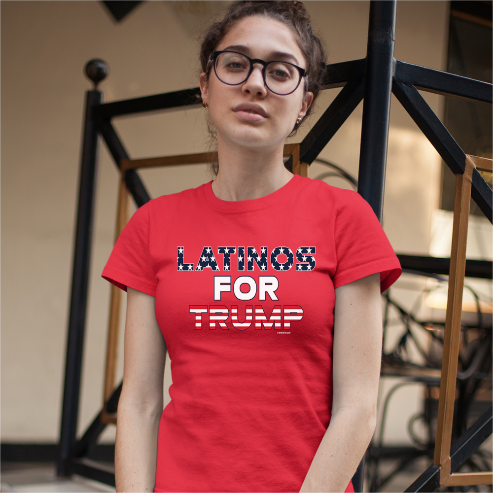 A political print saying "Latinos for Trump". The letters contain the Stars and Stripes of the American flag inside of them. A great choice to wear for a Trump rally or give as a gift to a Donald Trump and Mike Pence supporter before 2020 presidential elections.