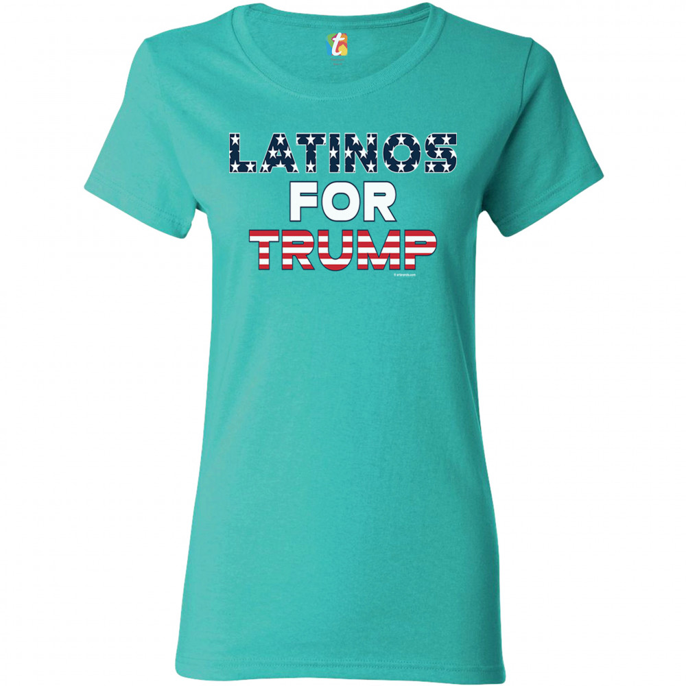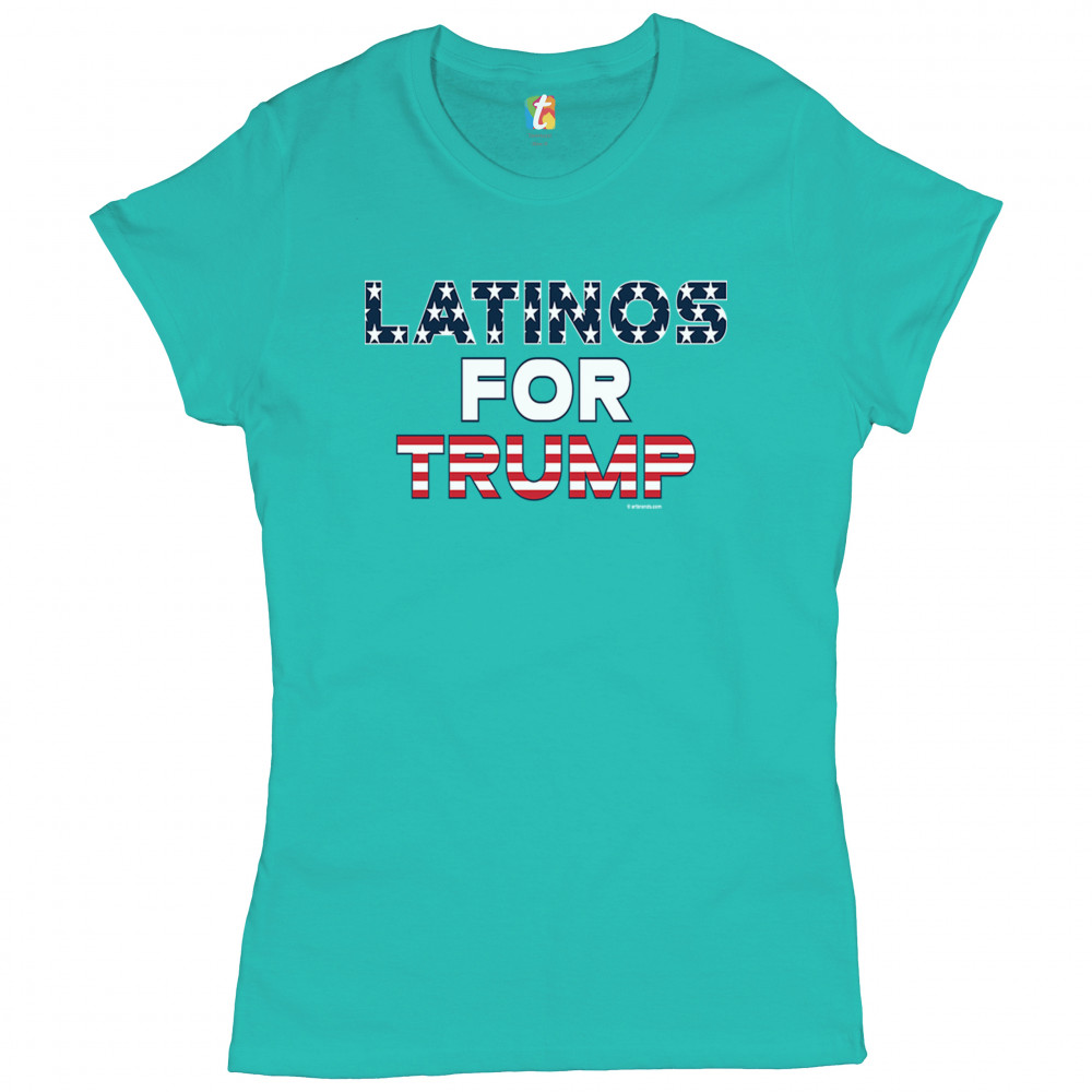 A political print saying "Latinos for Trump". The letters contain the Stars and Stripes of the American flag inside of them. A great choice to wear for a Trump rally or give as a gift to a Donald Trump and Mike Pence supporter before 2020 presidential elections.